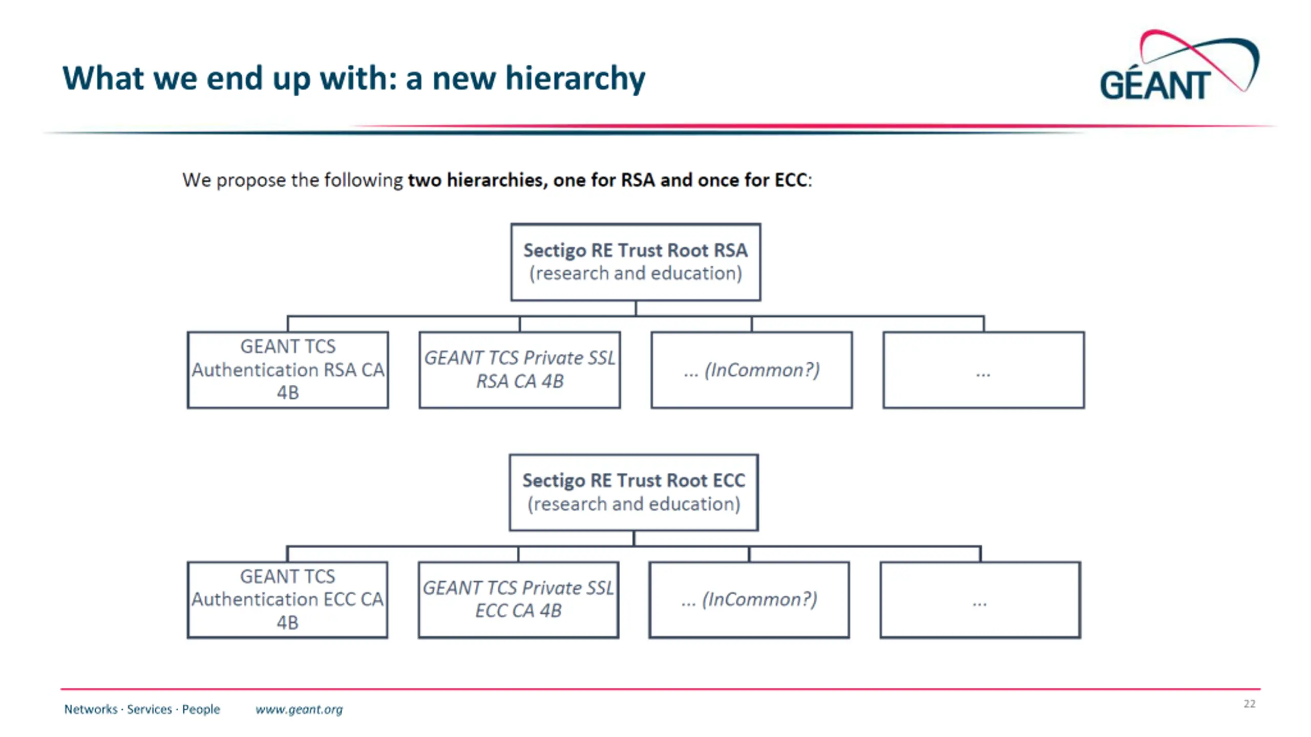 Base technical specifications for the Root The Sectigo RE Trust Roots can have any name that is appropriate for a Sectigo-wide private CA root, although a reflection of the constituency name ( research and education , or IGTF) is helpful in identifying the root as a community private trust root. The RSA and ECC variants should have similar, but not identical, subject names. There should be two Sectigo RE Trust Roots, one using a RSA keys (>=4096 bit, SHA-384 or stronger), and one ECC (P-384 with SHA-384 or stronger) The Sectigo RE Trust Roots shall be self-signed Shall be valid till at least May 1, 2033 GMT, but MAY be valid until Jan 18 23:59:59 2038 GMT It shall be able to issue CRLs for the (subordinate CA) certificates it issues, and the CRL shall have a validity period of at most 400 days (nextUpdate set to no more than 400 days after issuance, and no shorter than 7 days after issuance). It shall have OCSP support, and use a globally distributed (reasonably low latency) CDN for responding to OCSP queries 23 Networks Services People www.geant.org