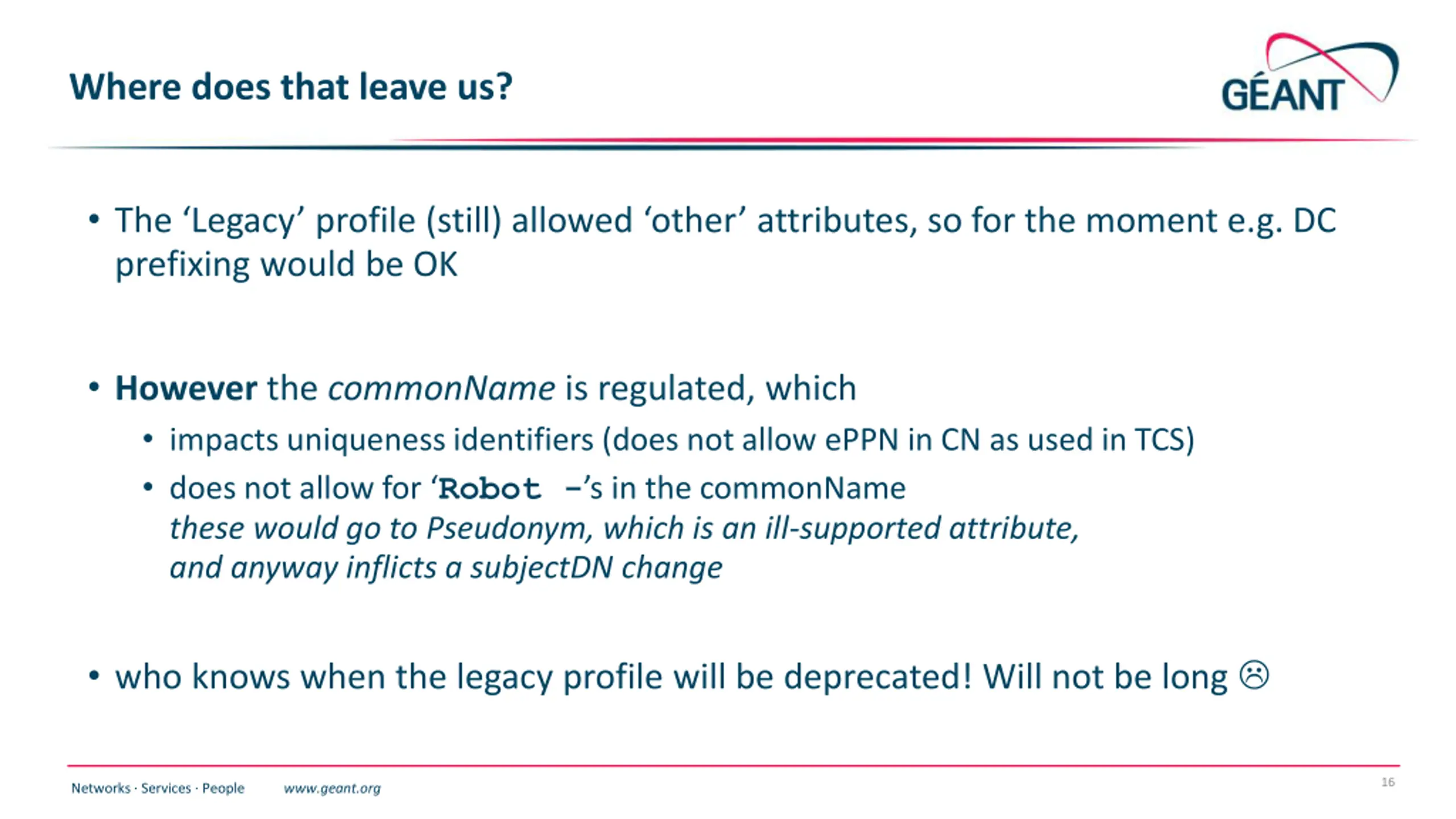 Where does that leave us? The Legacy profile (still) allowed other attributes, so for the moment e.g. DC prefixing would be OK However the commonName is regulated, which impacts uniqueness identifiers (does not allow ePPN in CN as used in TCS) does not allow for Robot - s in the commonName these would go to Pseudonym, which is an ill-supported attribute, and anyway inflicts a subjectDN change who knows when the legacy profile will be deprecated! Will not be long 16 Networks Services People www.geant.org