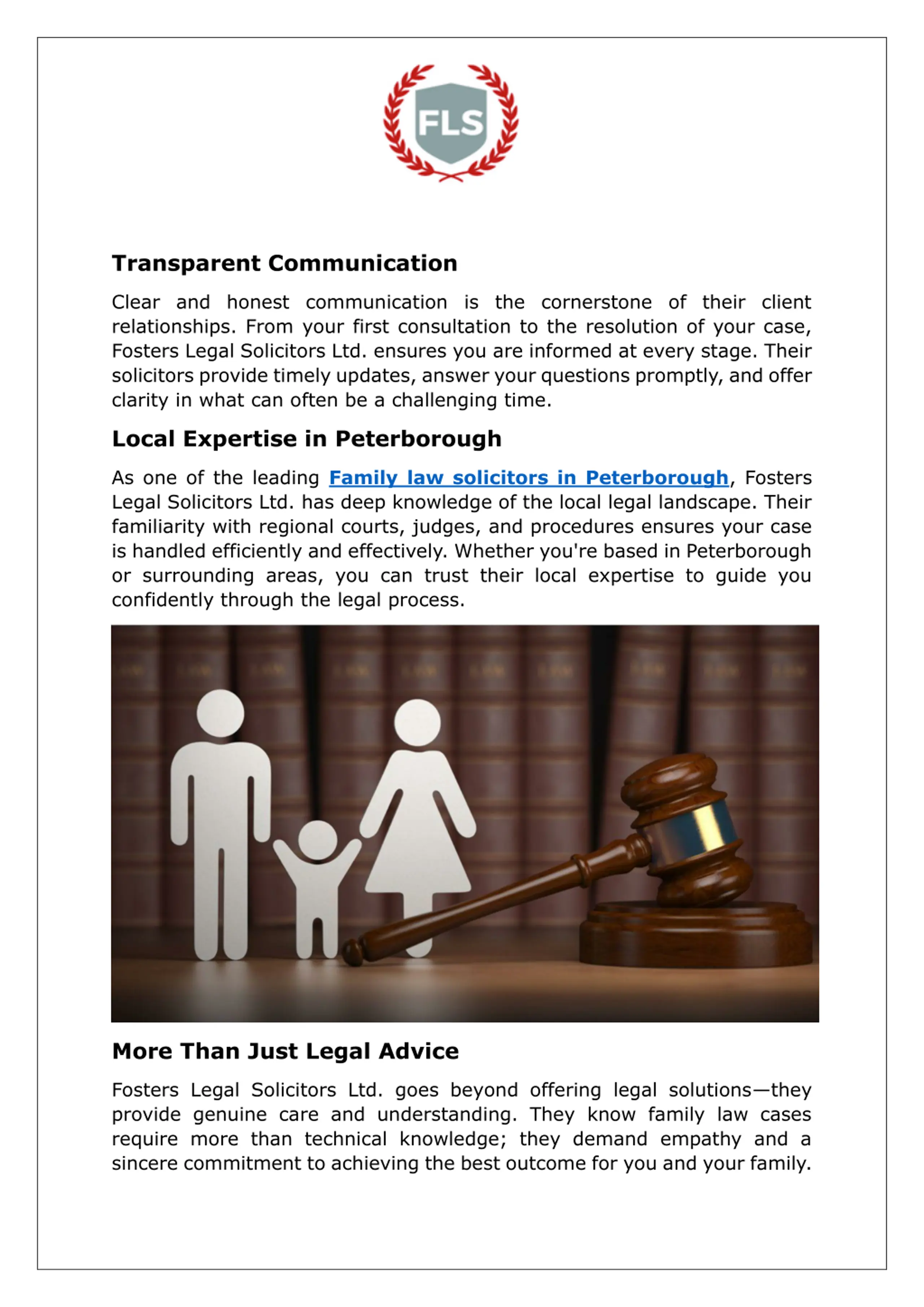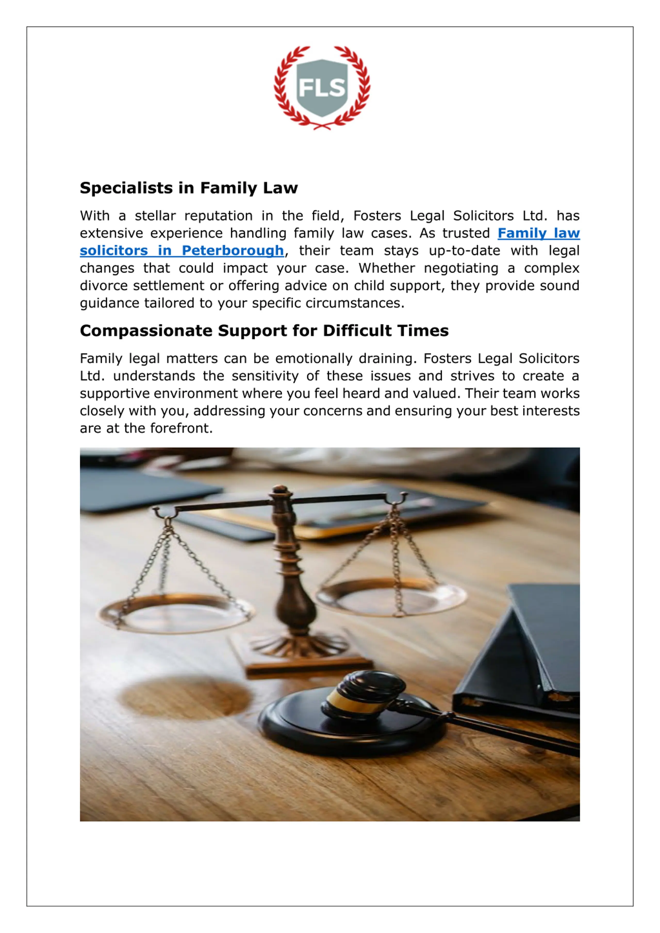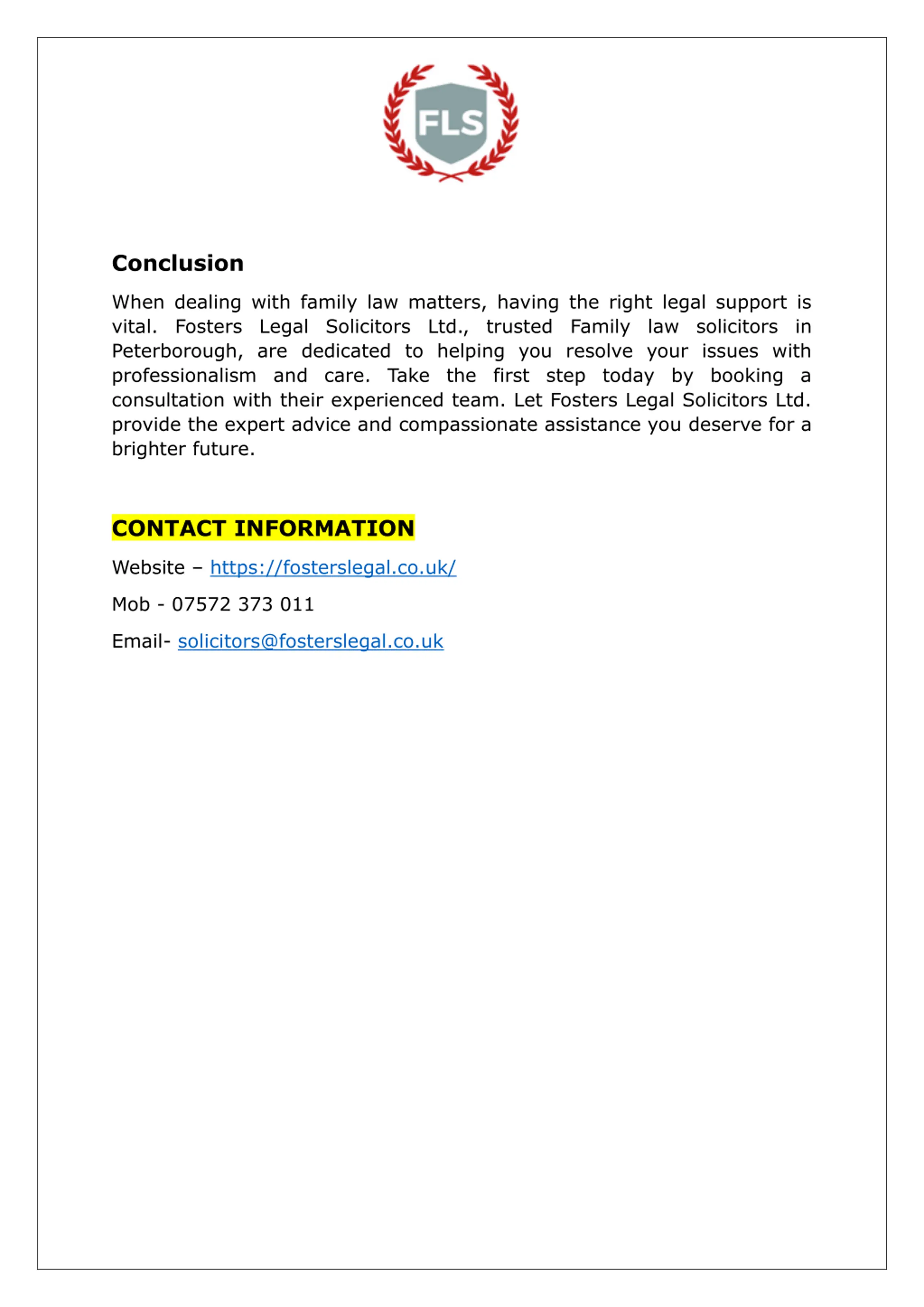 Conclusion When dealing with family law matters, having the right legal support is vital. Fosters Legal Solicitors Ltd., trusted Family law solicitors in Peterborough, are dedicated to helping you resolve your issues with professionalism and care. Take the first step today by booking a consultation with their experienced team. Let Fosters Legal Solicitors Ltd. provide the expert advice and compassionate assistance you deserve for a brighter future. CONTACT INFORMATION Website https://fosterslegal.co.uk/ Mob - 07572 373 011 Email- solicitors@fosterslegal.co.uk