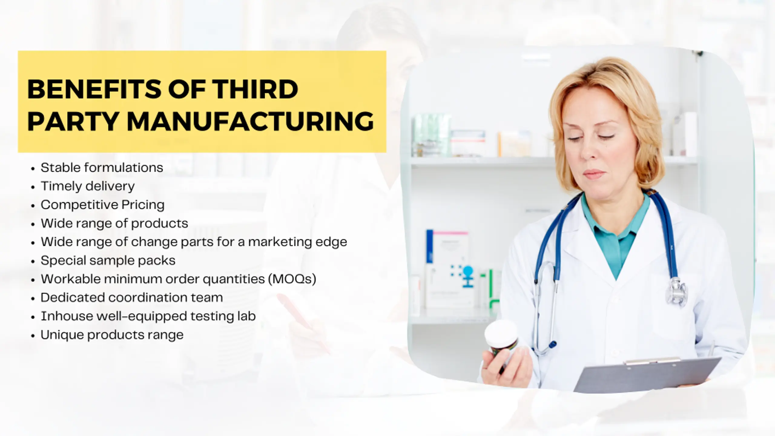 BENEFITS OF THIRD PARTY MANUFACTURING Stable formulations Timely delivery Competitive Pricing Wide range of products Wide range of change parts for a marketing edge Special sample packs Workable minimum order quantities (MOQs) Dedicated coordination team Inhouse well-equipped testing lab Unique products range