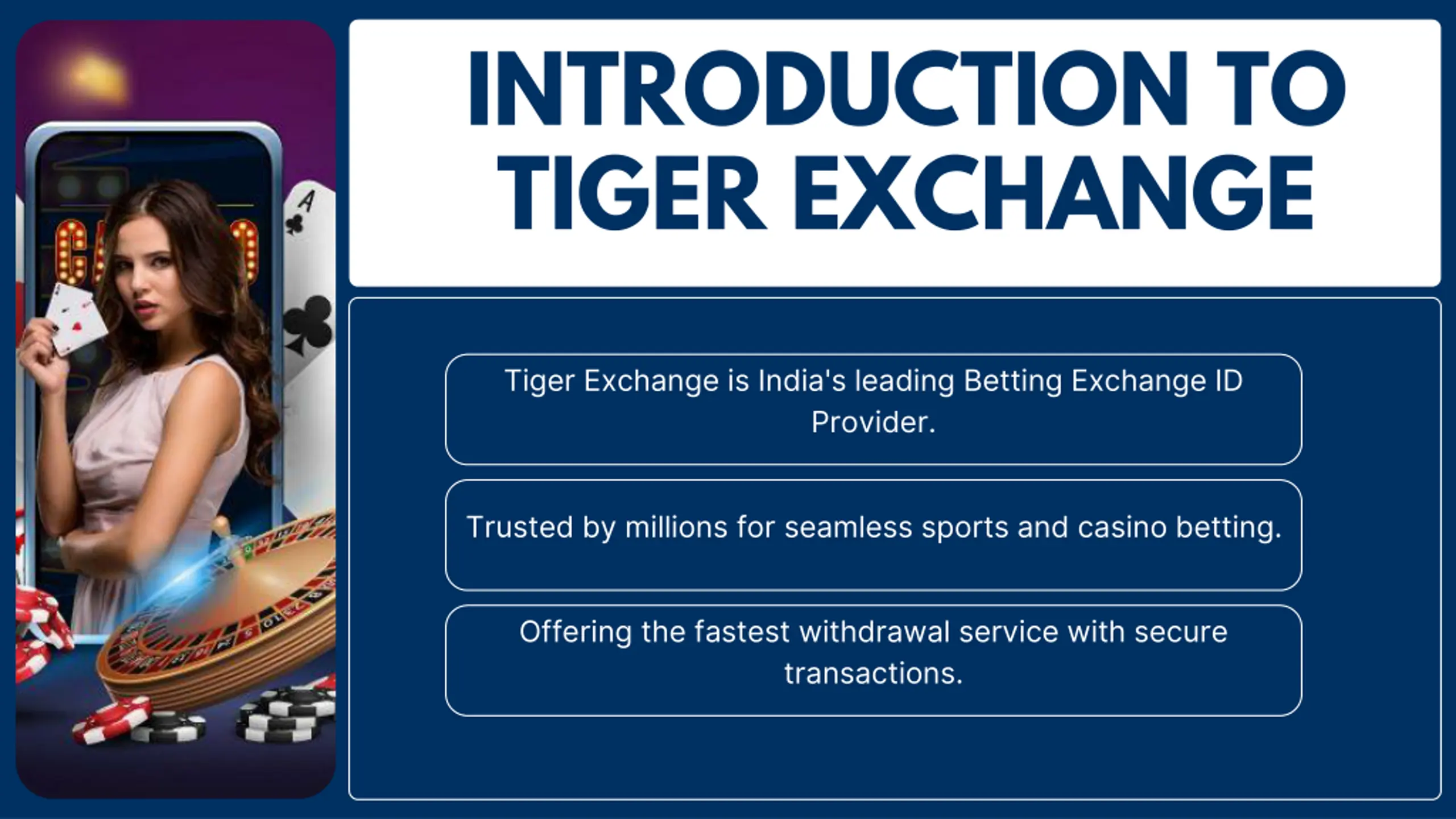 INTRODUCTION TO TIGER EXCHANGE Tiger Exchange is India's leading Betting Exchange ID Provider. Trusted by millions for seamless sports and casino betting. Offering the fastest withdrawal service with secure transactions.