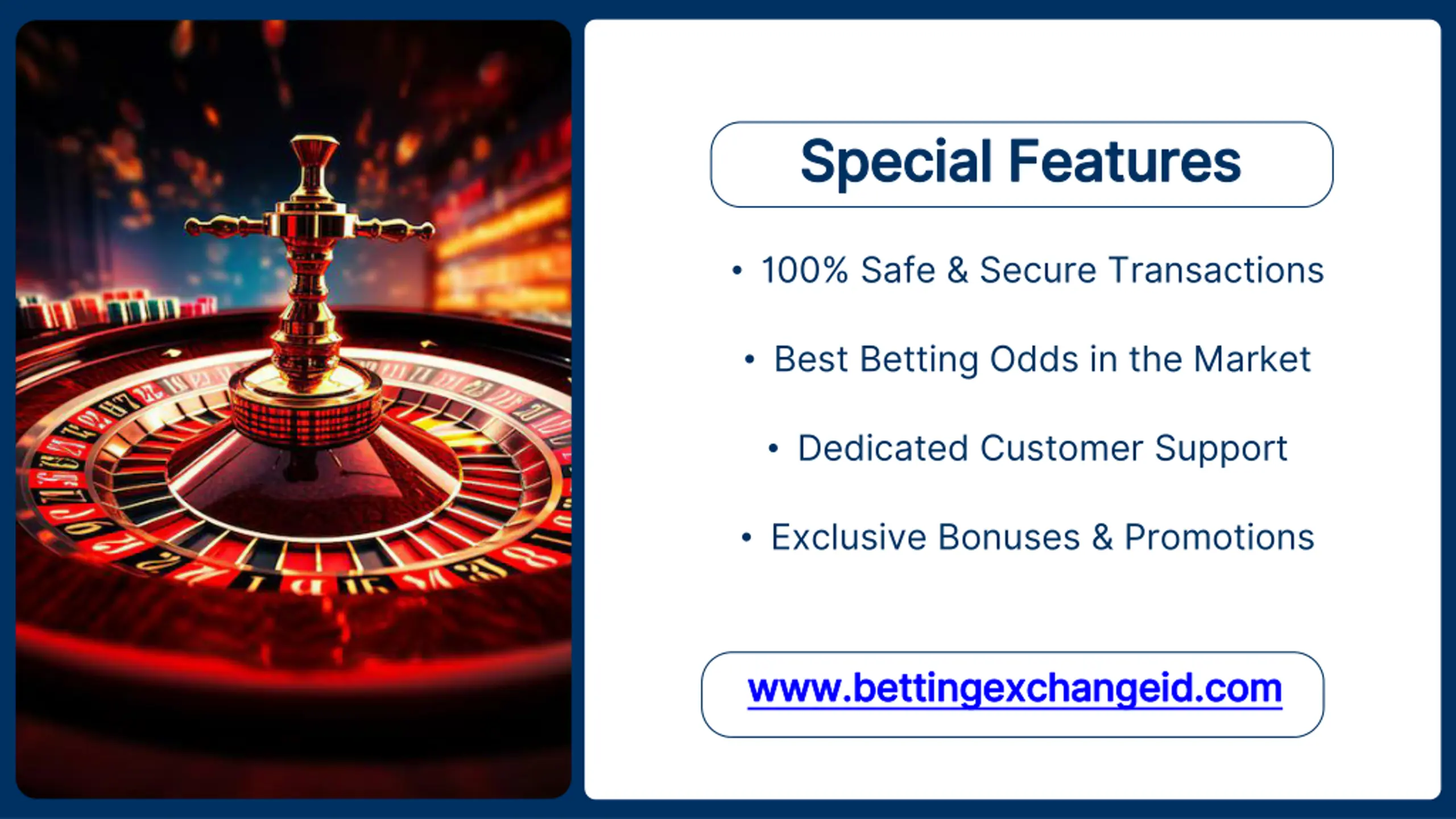 Special Features Special Features 100% Safe & Secure Transactions Best Betting Odds in the Market Dedicated Customer Support Exclusive Bonuses & Promotions www.bettingexchangeid.com www.bettingexchangeid.com