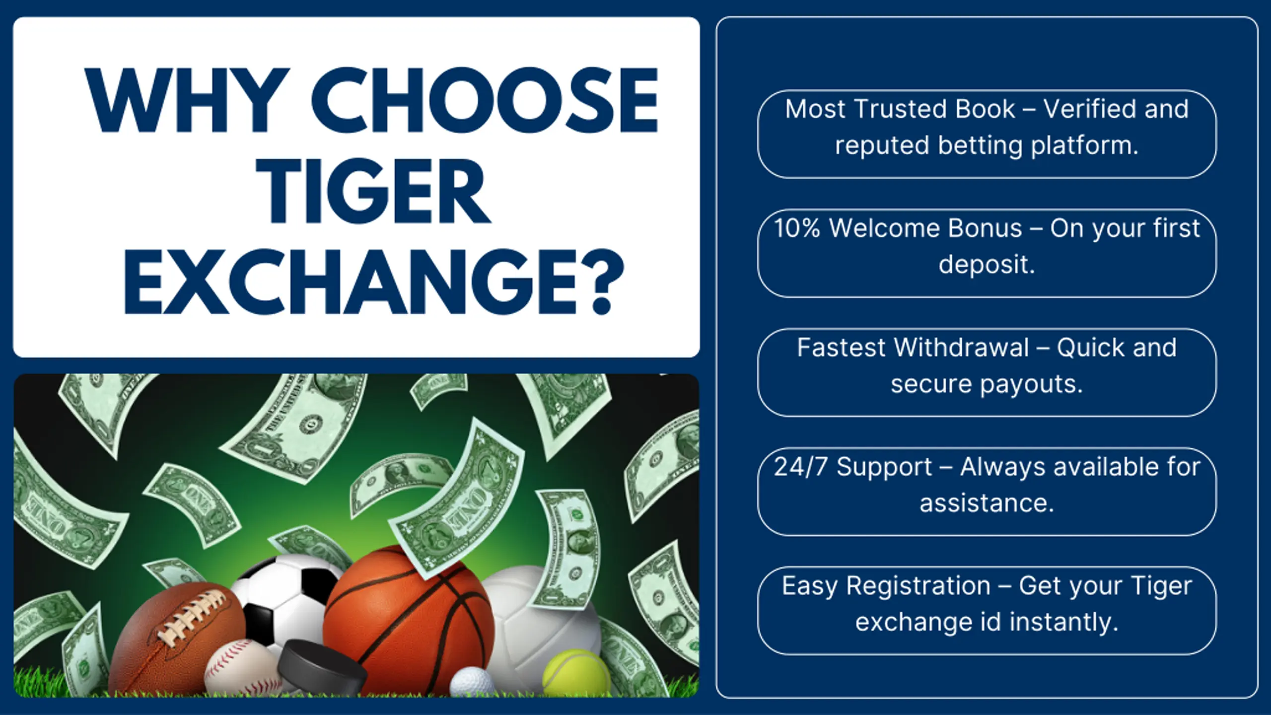WHY CHOOSE TIGER EXCHANGE? Most Trusted Book Verified and reputed betting platform. 10% Welcome Bonus On your first deposit. Fastest Withdrawal Quick and secure payouts. 24/7 Support Always available for assistance. Easy Registration Get your Tiger exchange id instantly.
