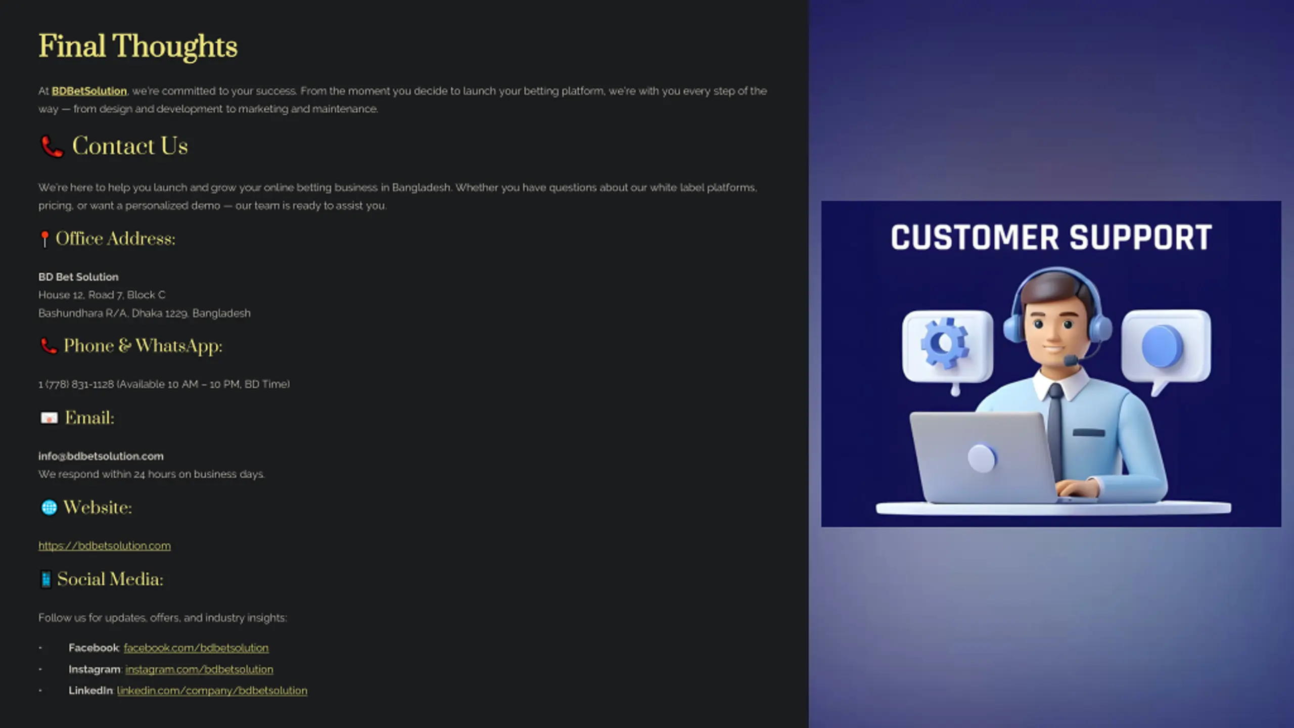 Final Thoughts Final Thoughts At BDBetSolution, we re committed to your success. From the moment you decide to launch your betting platform, we re with you every step of the way from design and development to marketing and maintenance. Contact Us We re here to help you launch and grow your online betting business in Bangladesh. Whether you have questions about our white label platforms, pricing, or want a personalized demo our team is ready to assist you. Office Address: BD Bet Solution House 12, Road 7, Block C Bashundhara R/A, Dhaka 1229, Bangladesh Phone & WhatsApp: 1 (778) 831-1128 (Available 10 AM 10 PM, BD Time) Email: info@bdbetsolution.com We respond within 24 hours on business days. Website: https://bdbetsolution.com Social Media: Follow us for updates, offers, and industry insights: Facebook: facebook.com/bdbetsolution Instagram: instagram.com/bdbetsolution LinkedIn: linkedin.com/company/bdbetsolution preencoded.png