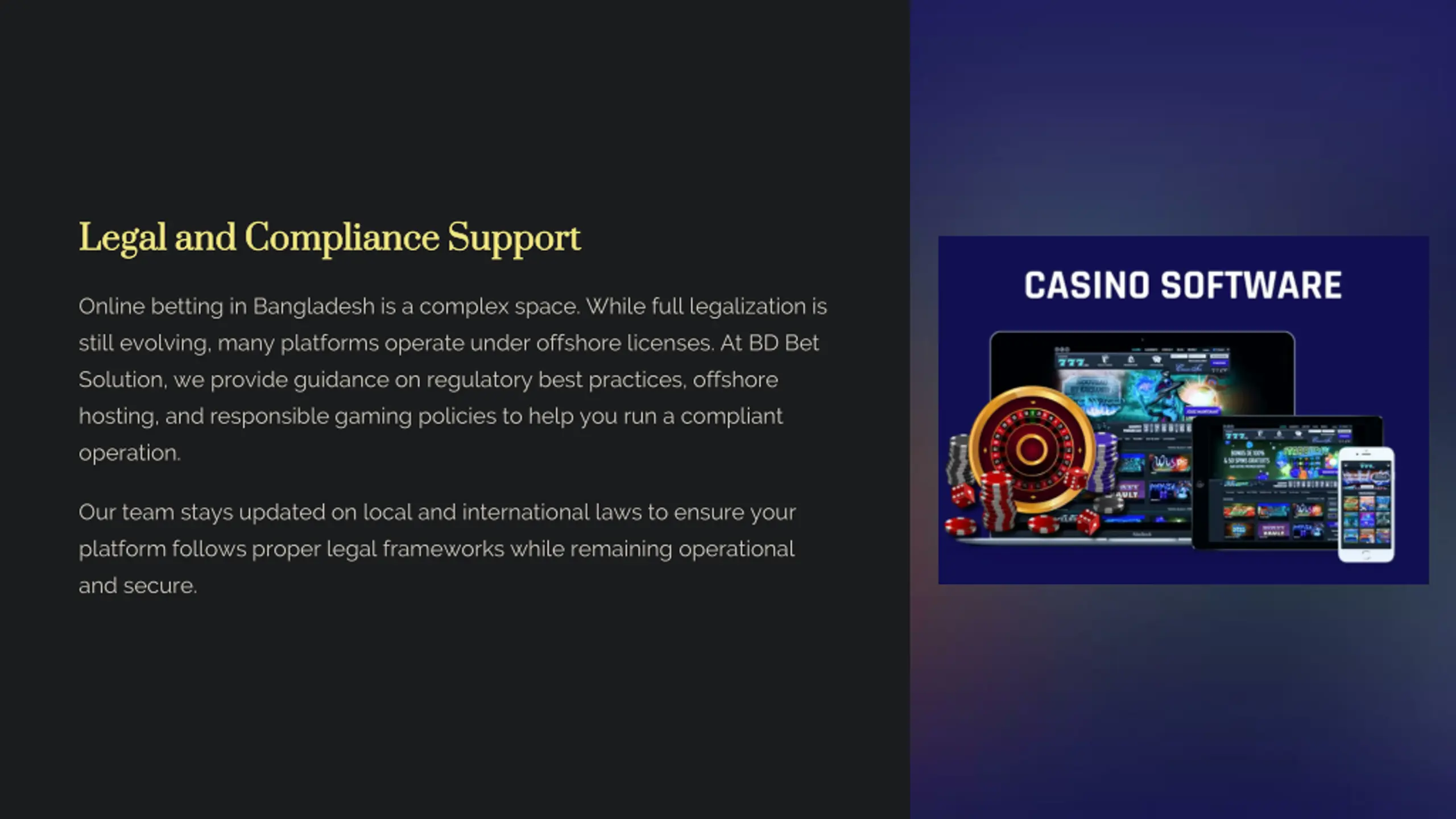 Legal and Compliance Support Legal and Compliance Support Online betting in Bangladesh is a complex space. While full legalization is still evolving, many platforms operate under offshore licenses. At BD Bet Solution, we provide guidance on regulatory best practices, offshore hosting, and responsible gaming policies to help you run a compliant operation. Our team stays updated on local and international laws to ensure your platform follows proper legal frameworks while remaining operational and secure. preencoded.png