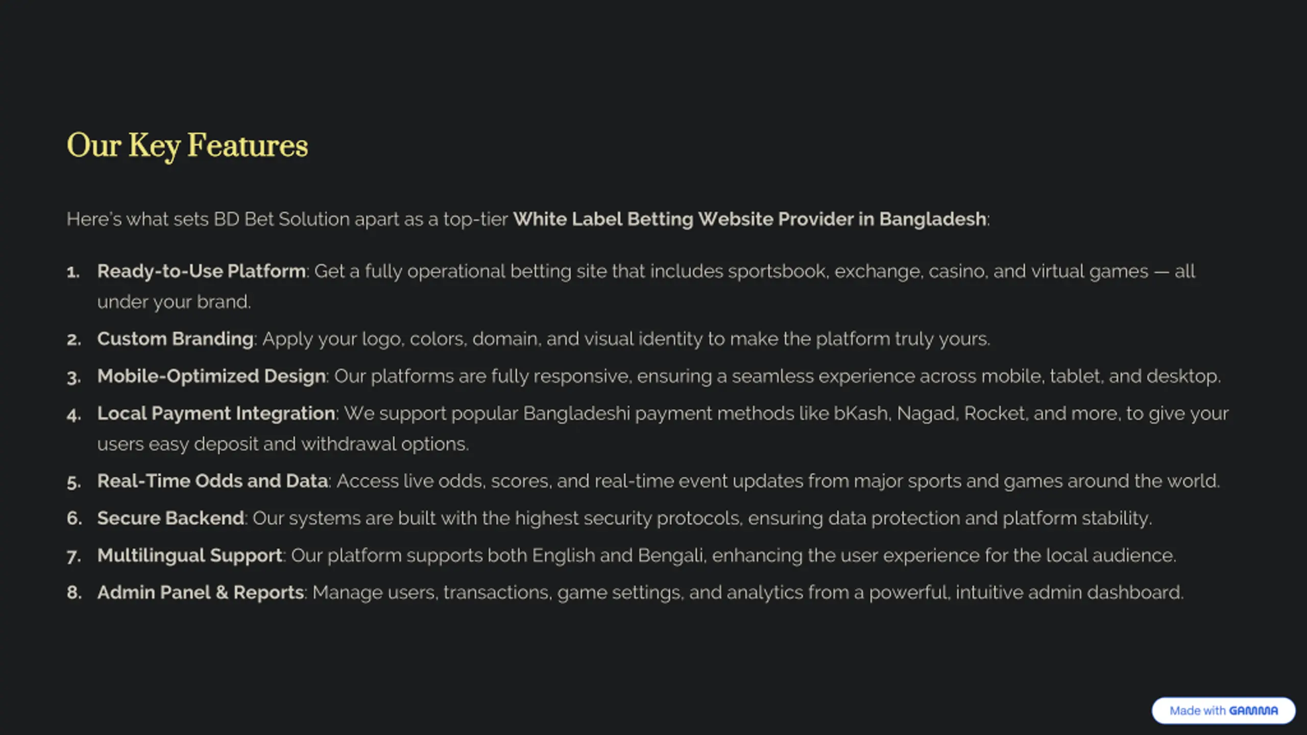 Our Key Features Our Key Features Here s what sets BD Bet Solution apart as a top-tier White Label Betting Website Provider in Bangladesh: 1. Ready-to-Use Platform: Get a fully operational betting site that includes sportsbook, exchange, casino, and virtual games all under your brand. 2. Custom Branding: Apply your logo, colors, domain, and visual identity to make the platform truly yours. 3. Mobile-Optimized Design: Our platforms are fully responsive, ensuring a seamless experience across mobile, tablet, and desktop. 4. Local Payment Integration: We support popular Bangladeshi payment methods like bKash, Nagad, Rocket, and more, to give your users easy deposit and withdrawal options. 5. Real-Time Odds and Data: Access live odds, scores, and real-time event updates from major sports and games around the world. 6. Secure Backend: Our systems are built with the highest security protocols, ensuring data protection and platform stability. 7. Multilingual Support: Our platform supports both English and Bengali, enhancing the user experience for the local audience. 8. Admin Panel & Reports: Manage users, transactions, game settings, and analytics from a powerful, intuitive admin dashboard. preencoded.png