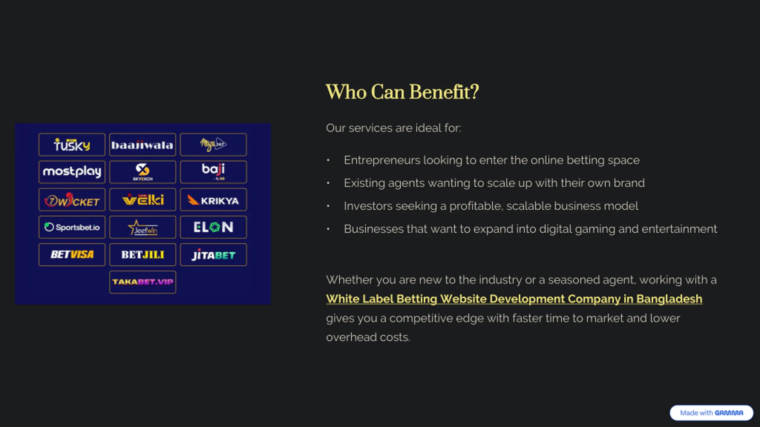 Who Can Benefit? Who Can Benefit? Our services are ideal for: Entrepreneurs looking to enter the online betting space Existing agents wanting to scale up with their own brand Investors seeking a profitable, scalable business model Businesses that want to expand into digital gaming and entertainment Whether you are new to the industry or a seasoned agent, working with a White Label Betting Website Development Company in Bangladesh gives you a competitive edge with faster time to market and lower overhead costs. preencoded.png