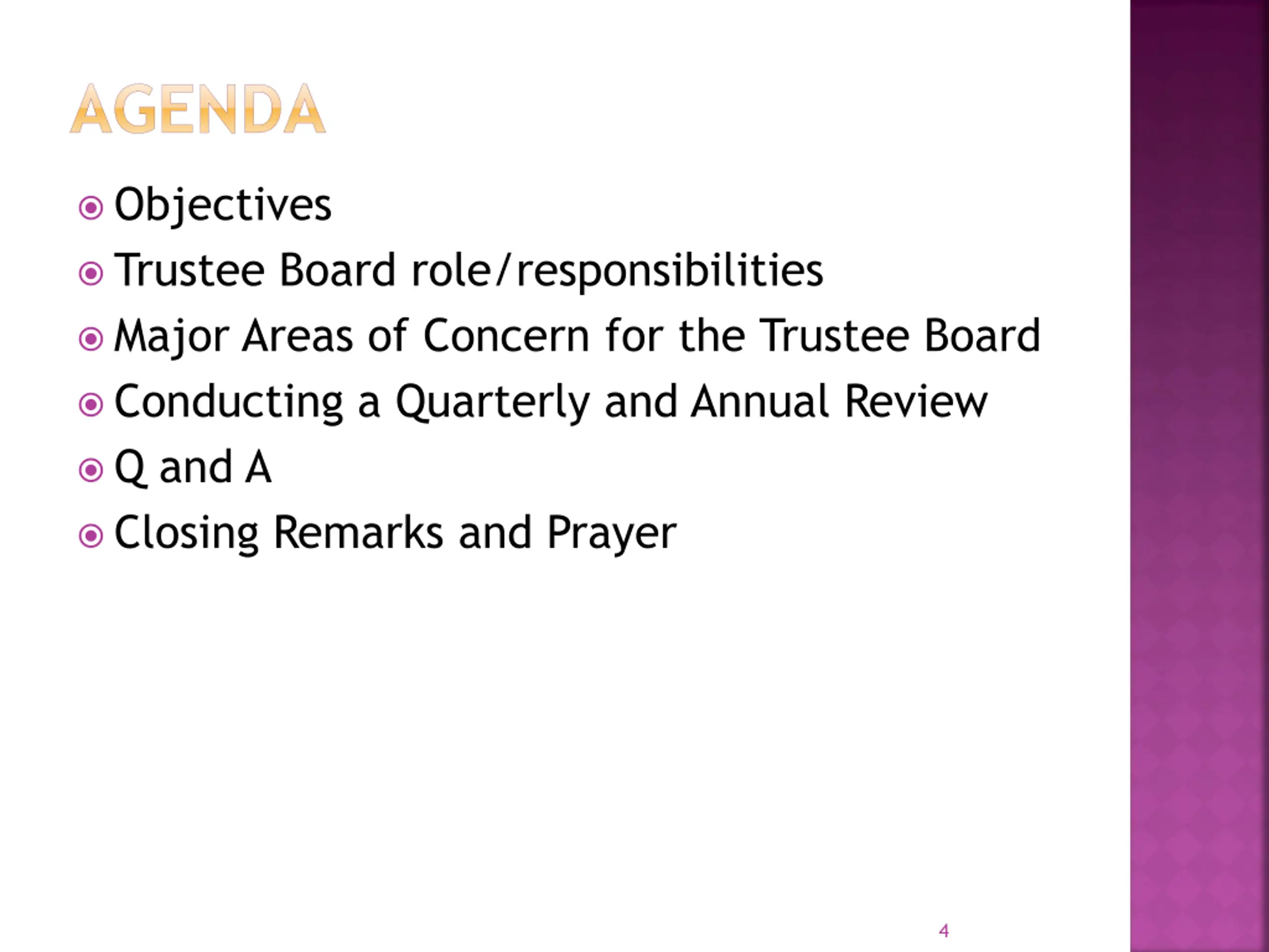 AGENDA Objectives Trustee Board role/responsibilities Major Areas of Concern for the Trustee Board Conducting a Quarterly and Annual Review Q and A Closing Remarks and Prayer 4