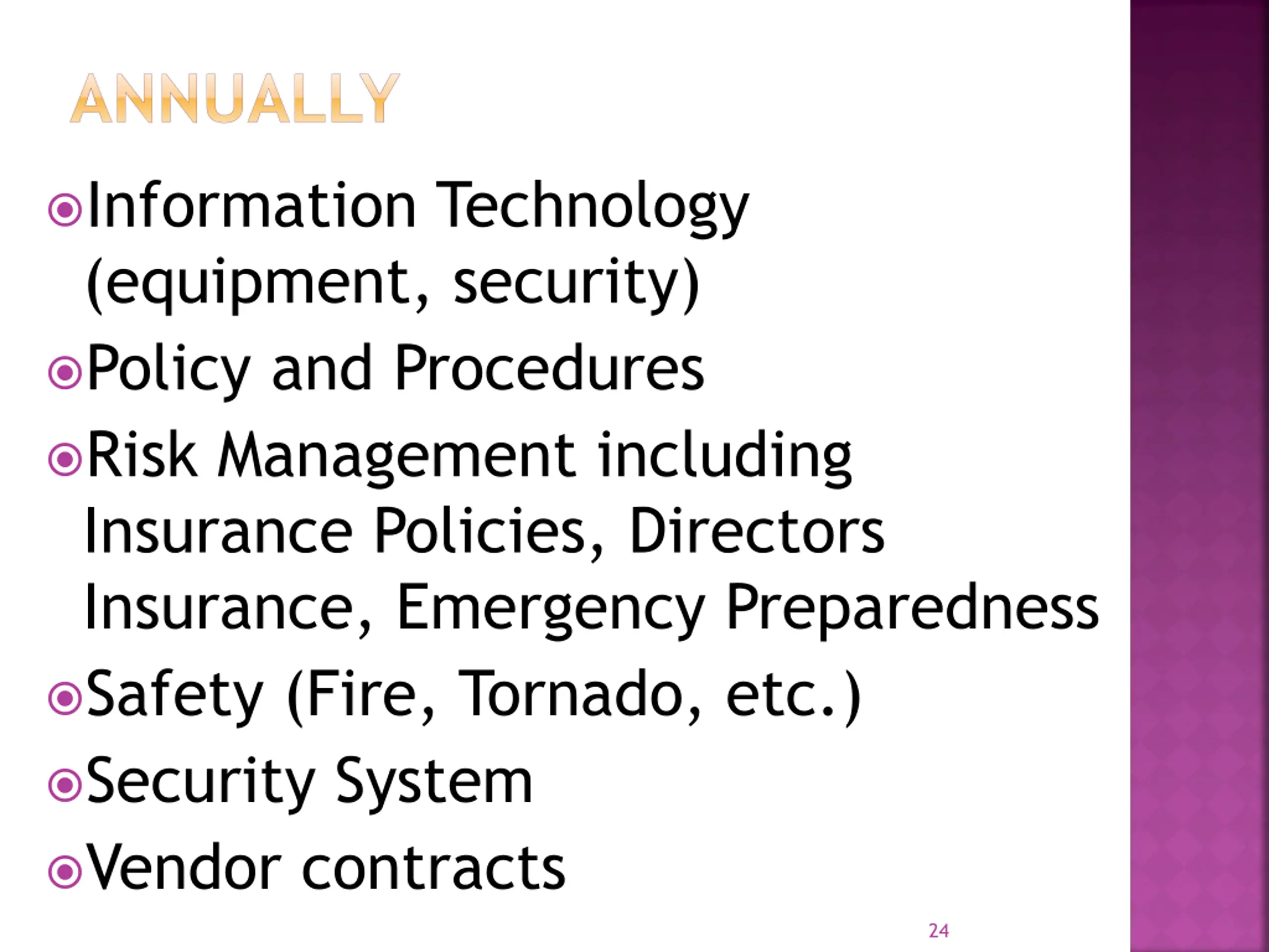 ANNUALLY Information Technology (equipment, security) Policy and Procedures Risk Management including Insurance Policies, Directors Insurance, Emergency Preparedness Safety (Fire, Tornado, etc.) Security System Vendor contracts 24