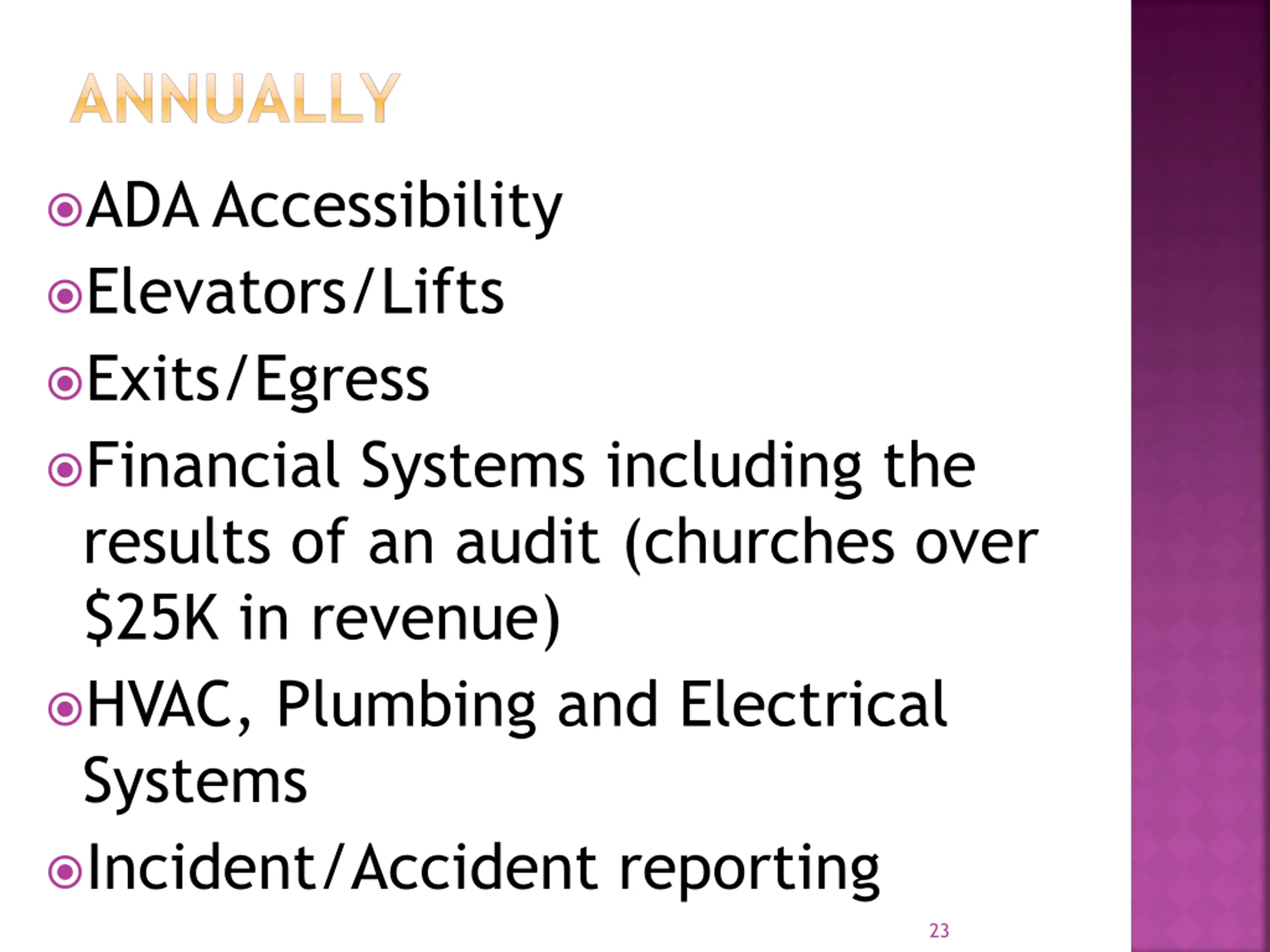 ANNUALLY ADA Accessibility Elevators/Lifts Exits/Egress Financial Systems including the results of an audit (churches over $25K in revenue) HVAC, Plumbing and Electrical Systems Incident/Accident reporting 23