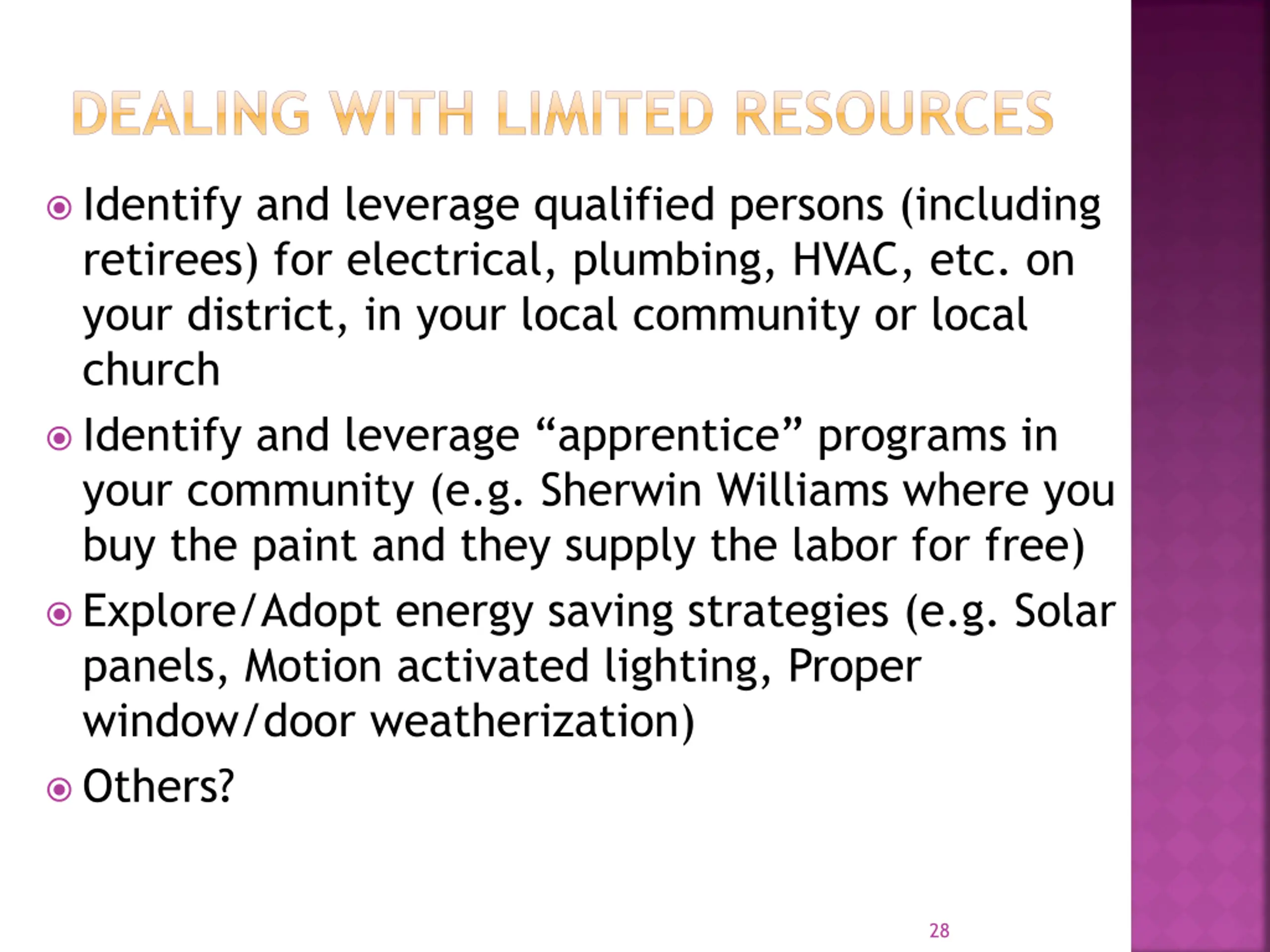 DEALING WITH LIMITED RESOURCES Identify and leverage qualified persons (including retirees) for electrical, plumbing, HVAC, etc. on your district, in your local community or local church Identify and leverage apprentice programs in your community (e.g. Sherwin Williams where you buy the paint and they supply the labor for free) Explore/Adopt energy saving strategies (e.g. Solar panels, Motion activated lighting, Proper window/door weatherization) Others? 28