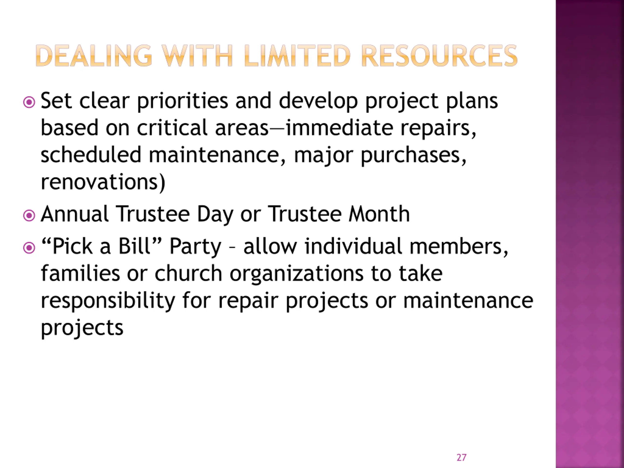DEALING WITH LIMITED RESOURCES Set clear priorities and develop project plans based on critical areas immediate repairs, scheduled maintenance, major purchases, renovations) Annual Trustee Day or Trustee Month Pick a Bill Party allow individual members, families or church organizations to take responsibility for repair projects or maintenance projects 27
