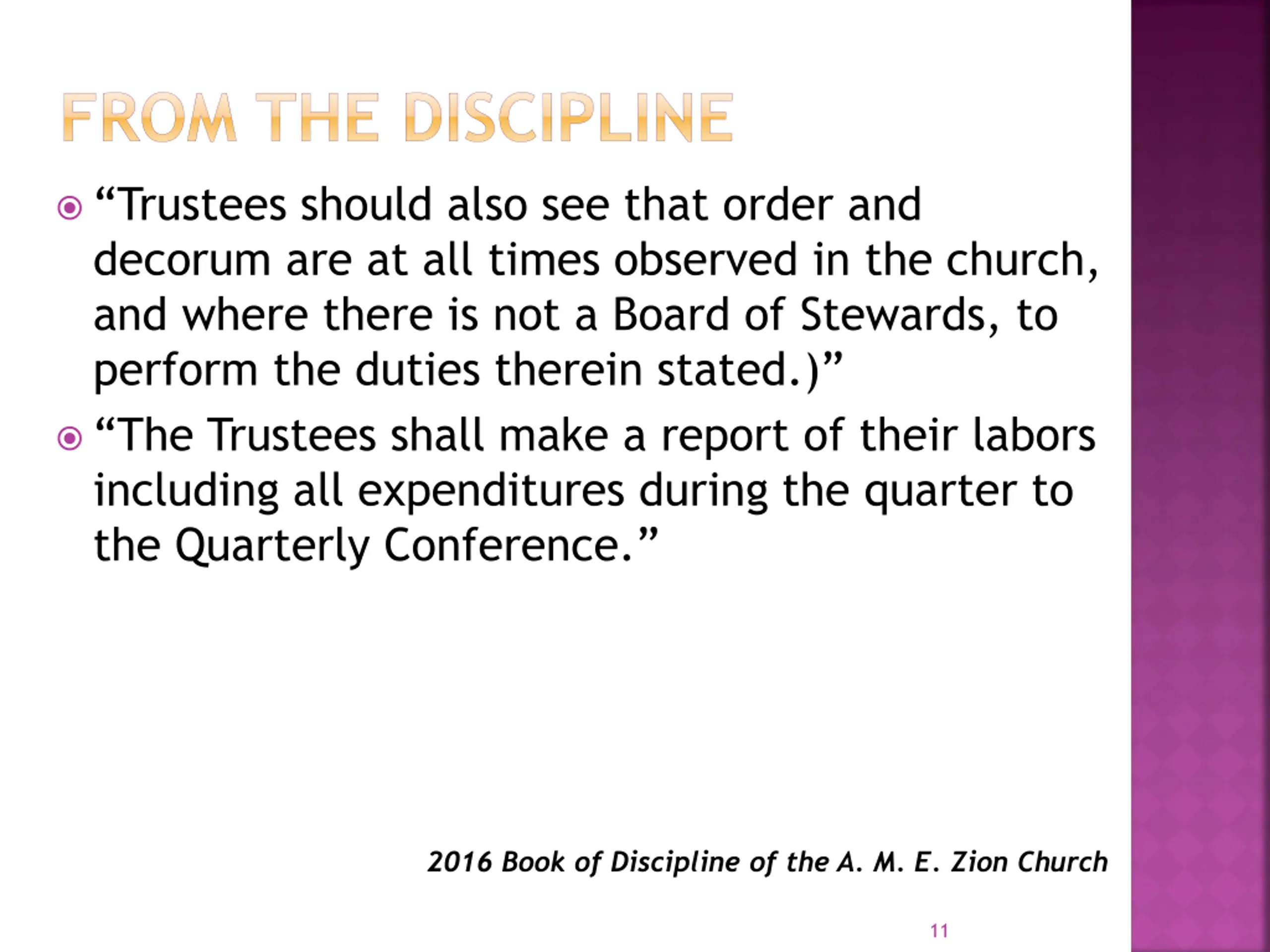FROM THE DISCIPLINE Trustees should also see that order and decorum are at all times observed in the church, and where there is not a Board of Stewards, to perform the duties therein stated.) The Trustees shall make a report of their labors including all expenditures during the quarter to the Quarterly Conference. 2016 Book of Discipline of the A. M. E. Zion Church 11