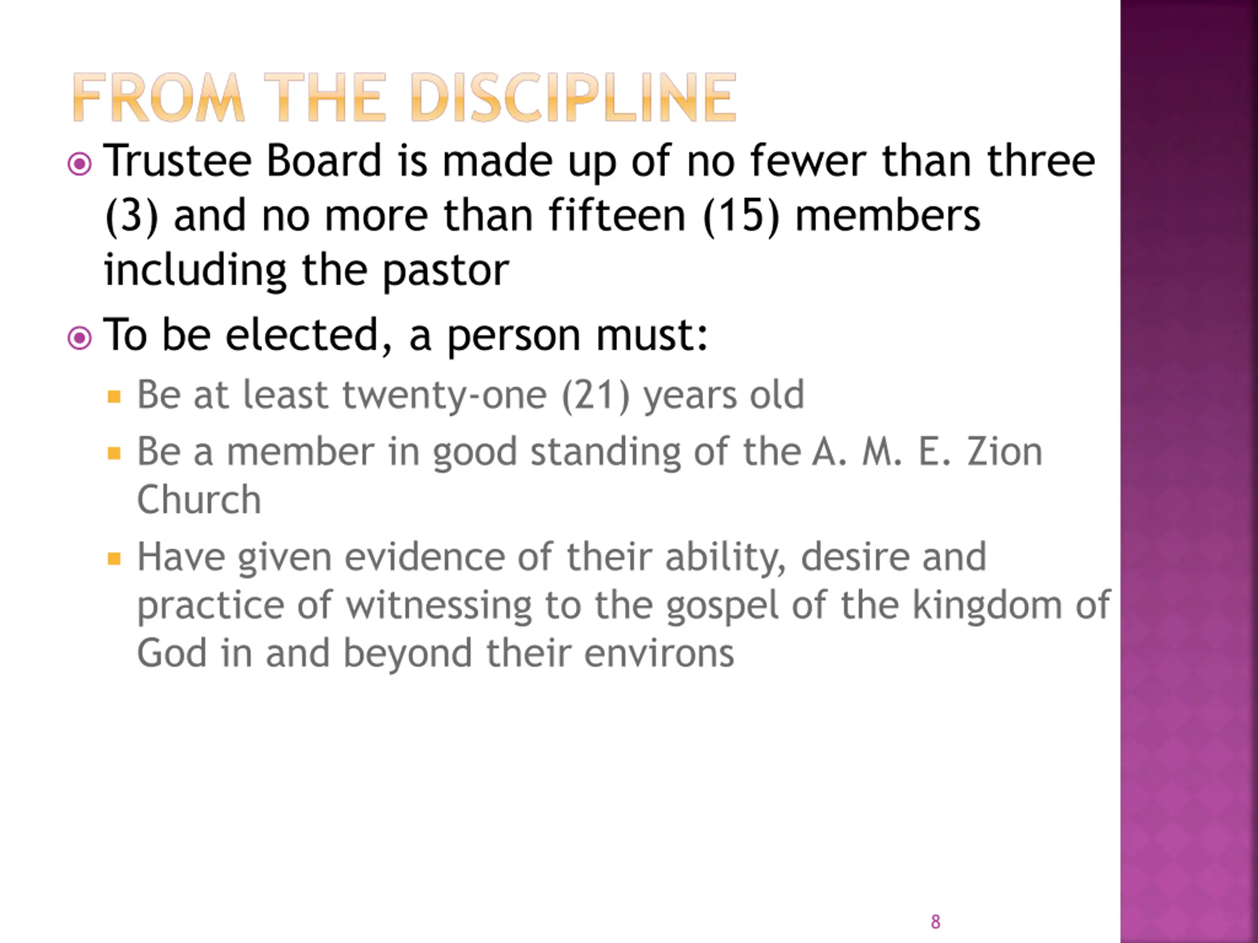 FROM THE DISCIPLINE Trustee Board is made up of no fewer than three (3) and no more than fifteen (15) members including the pastor To be elected, a person must: Be at least twenty-one (21) years old Be a member in good standing of the A. M. E. Zion Church Have given evidence of their ability, desire and practice of witnessing to the gospel of the kingdom of God in and beyond their environs 8