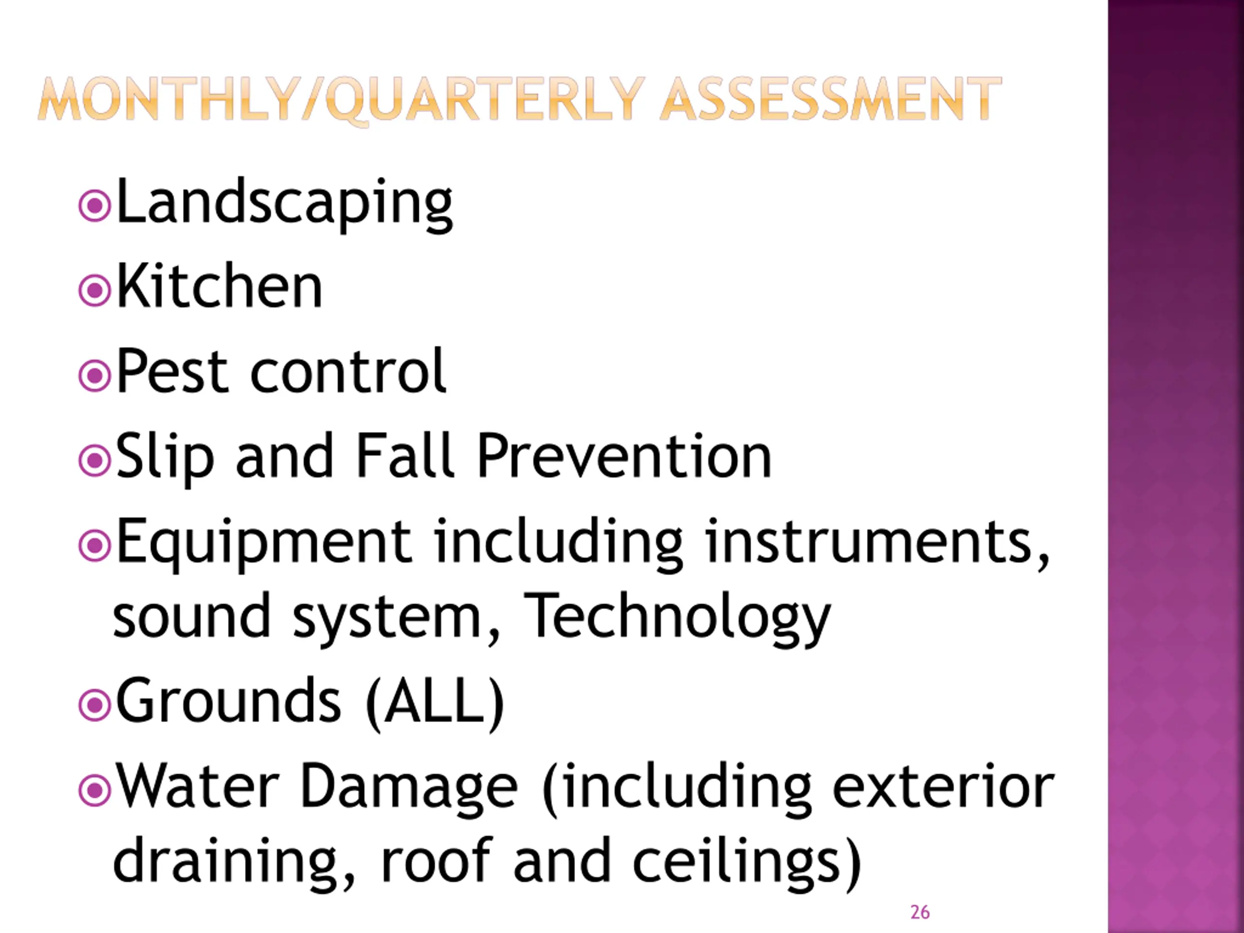 MONTHLY/QUARTERLY ASSESSMENT Landscaping Kitchen Pest control Slip and Fall Prevention Equipment including instruments, sound system, Technology Grounds (ALL) Water Damage (including exterior draining, roof and ceilings) 26
