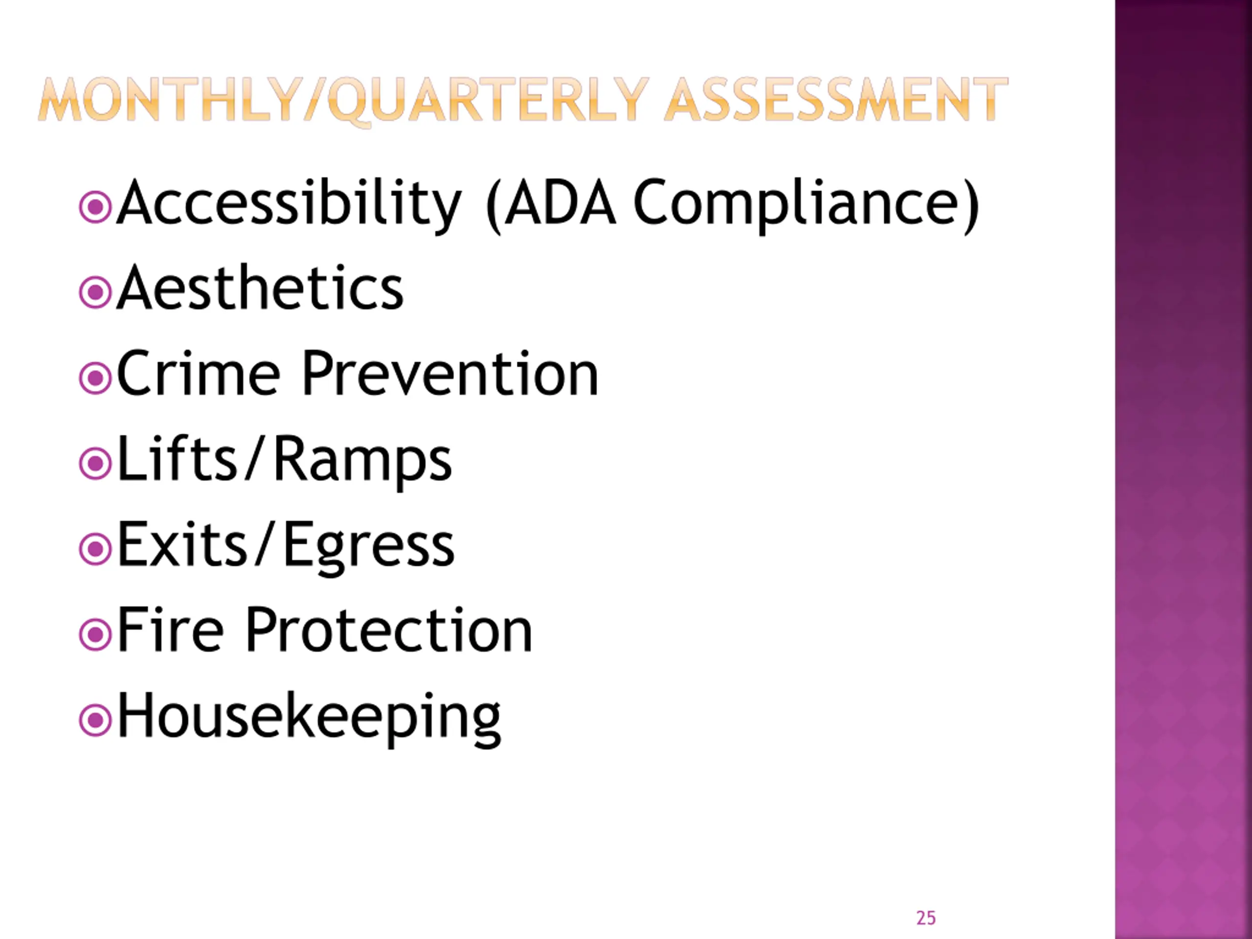 MONTHLY/QUARTERLY ASSESSMENT Accessibility (ADA Compliance) Aesthetics Crime Prevention Lifts/Ramps Exits/Egress Fire Protection Housekeeping 25