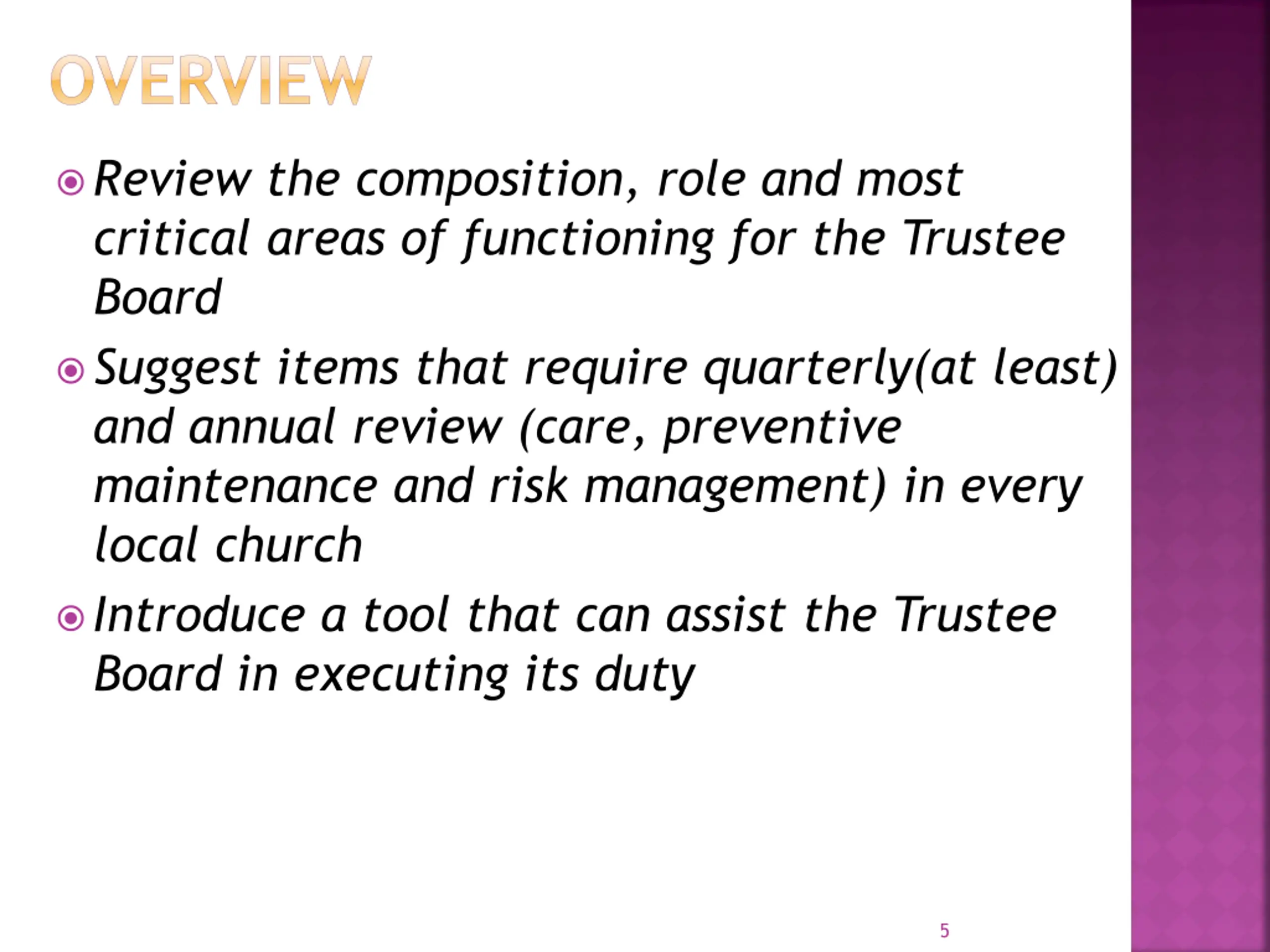 OVERVIEW Review the composition, role and most critical areas of functioning for the Trustee Board Suggest items that require quarterly(at least) and annual review (care, preventive maintenance and risk management) in every local church Introduce a tool that can assist the Trustee Board in executing its duty 5