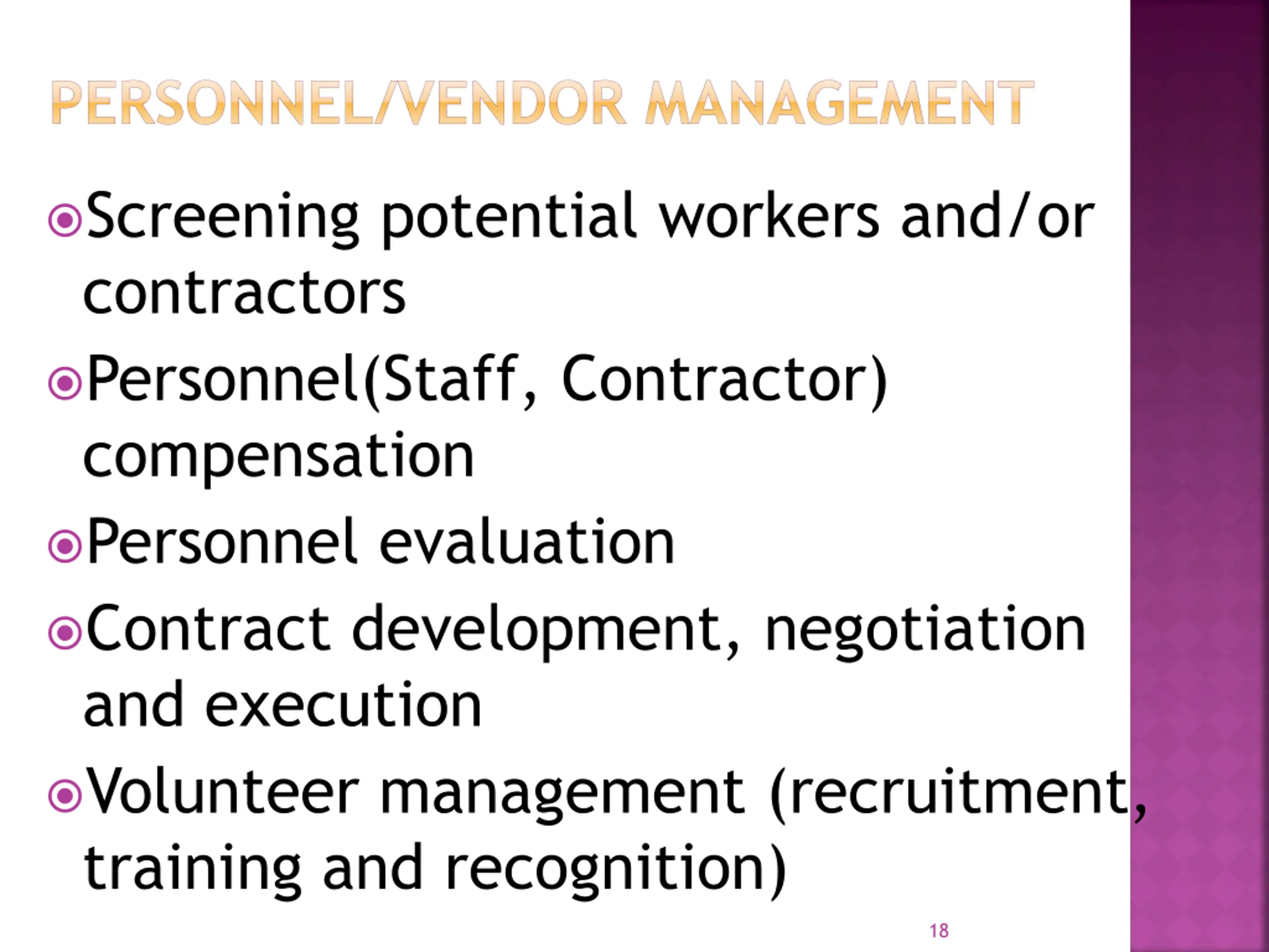 PERSONNEL/VENDOR MANAGEMENT Screening potential workers and/or contractors Personnel(Staff, Contractor) compensation Personnel evaluation Contract development, negotiation and execution Volunteer management (recruitment, training and recognition) 18