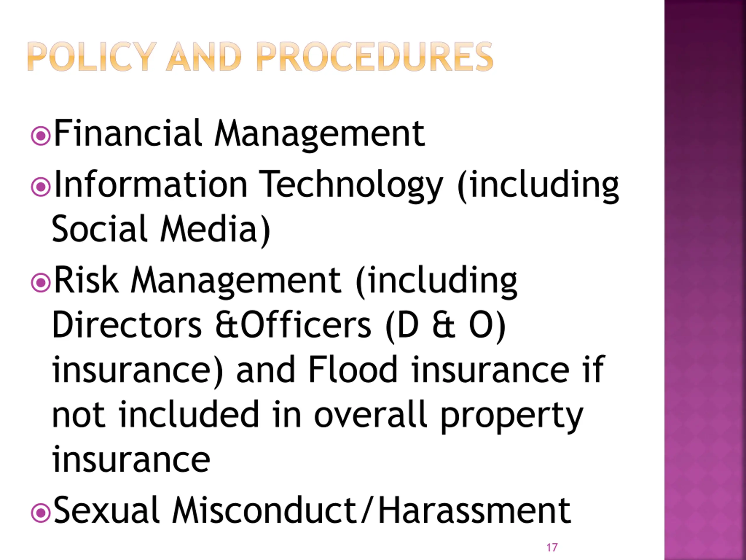POLICY AND PROCEDURES Financial Management Information Technology (including Social Media) Risk Management (including Directors &Officers (D & O) insurance) and Flood insurance if not included in overall property insurance Sexual Misconduct/Harassment 17