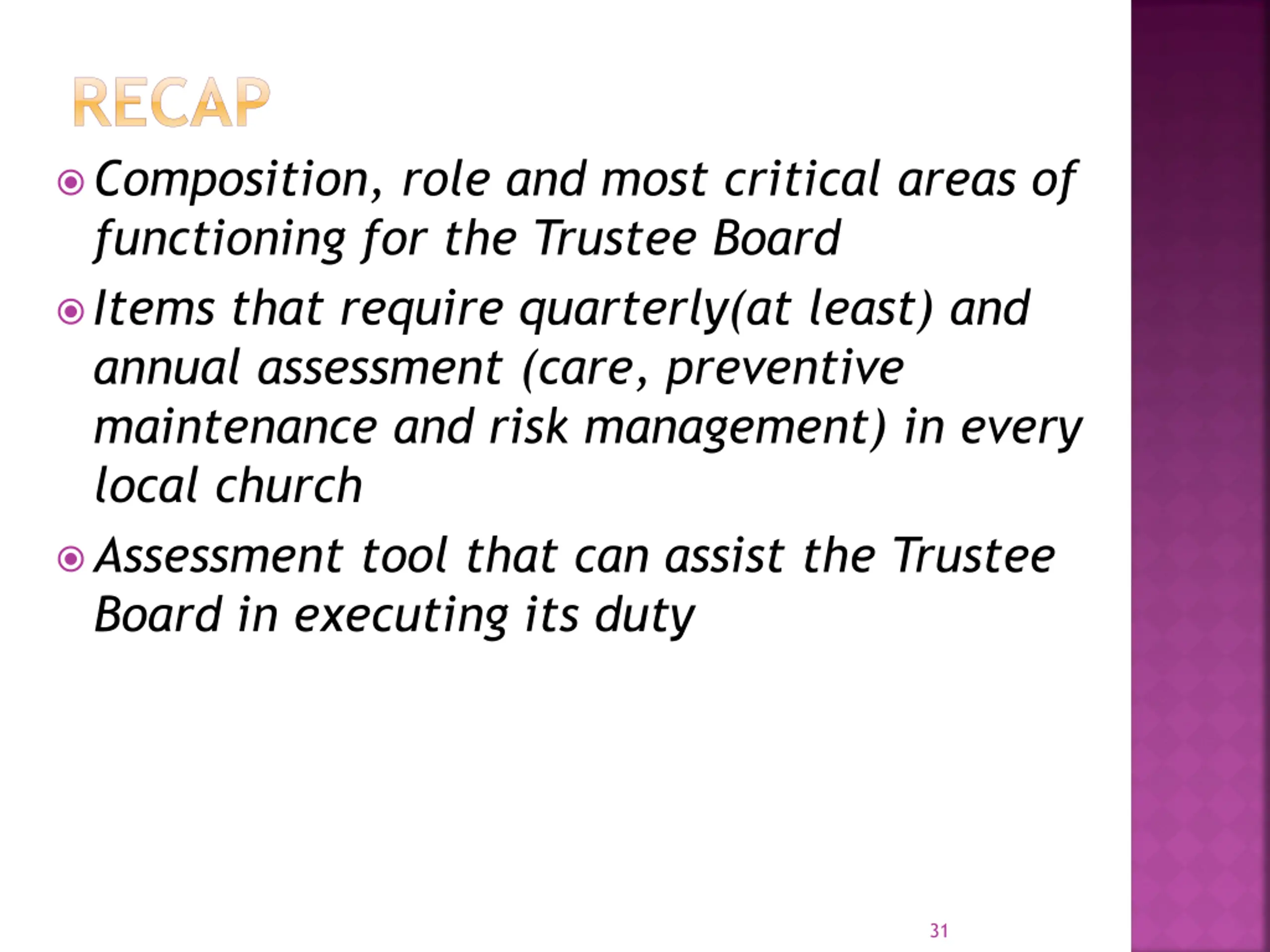 RECAP Composition, role and most critical areas of functioning for the Trustee Board Items that require quarterly(at least) and annual assessment (care, preventive maintenance and risk management) in every local church Assessment tool that can assist the Trustee Board in executing its duty 31