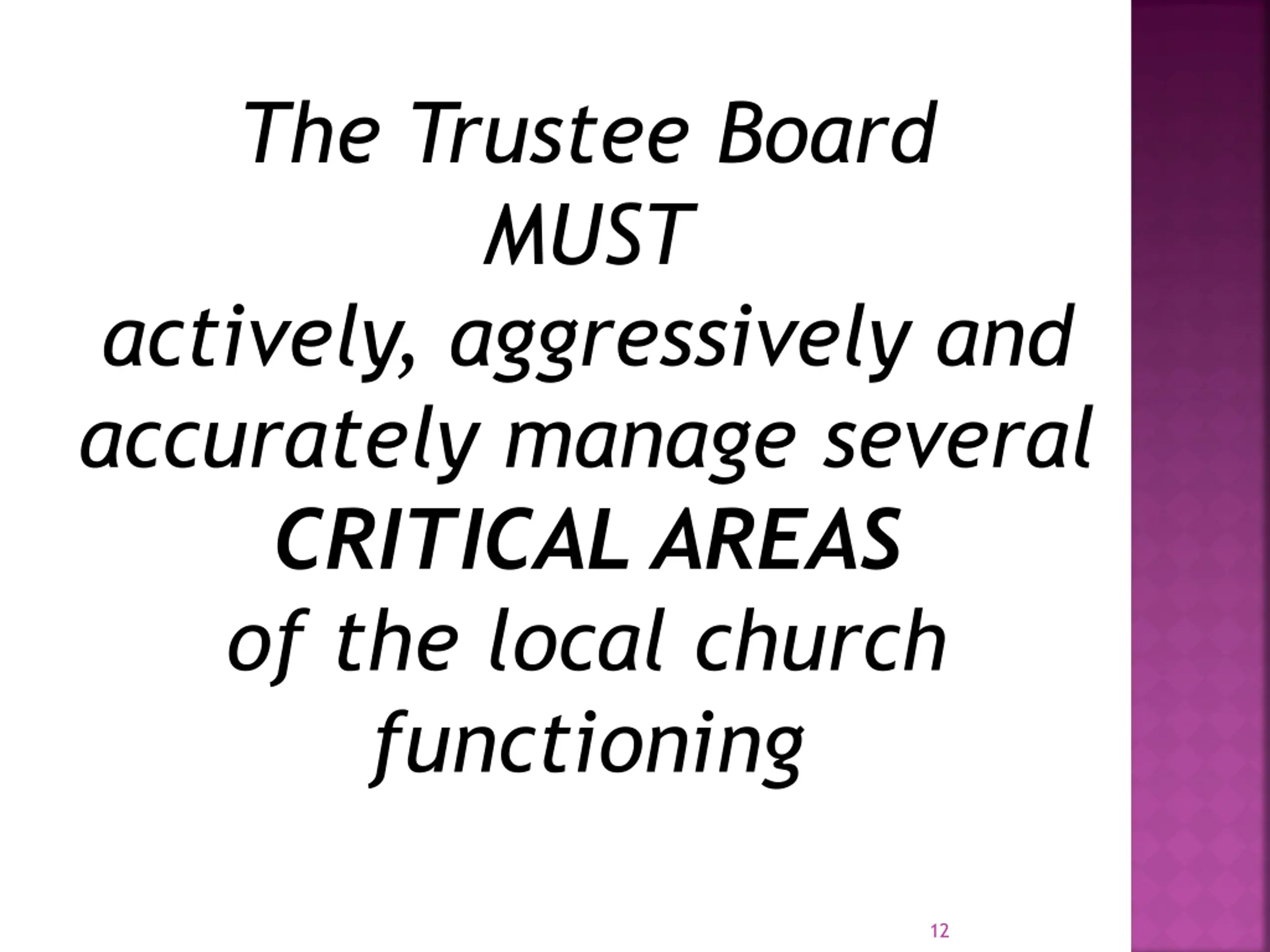 The Trustee Board MUST actively, aggressively and accurately manage several CRITICAL AREAS of the local church functioning 12