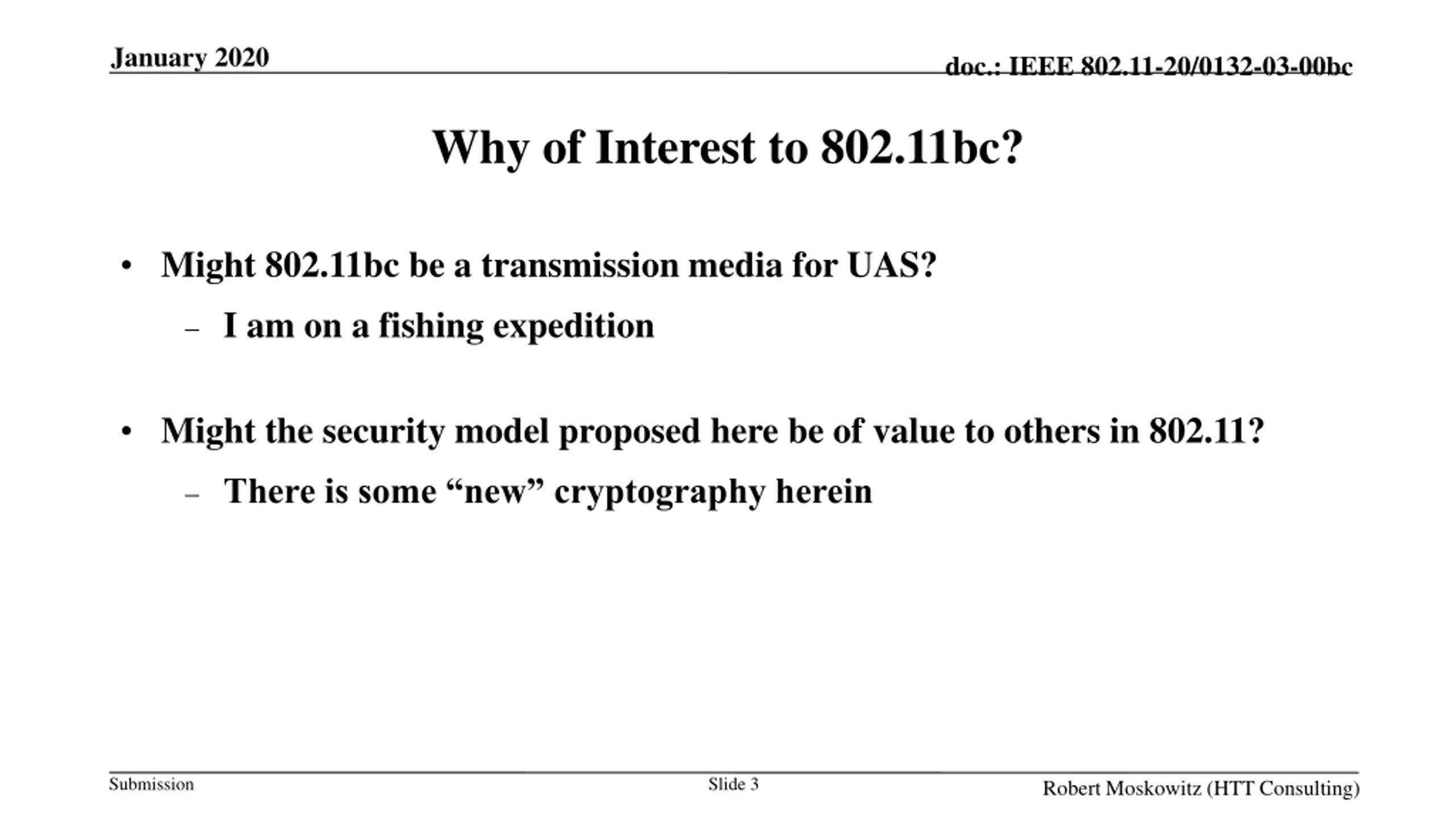 January 2020 doc.: IEEE 802.11-20/0132-03-00bc Why of Interest to 802.11bc? Might 802.11bc be a transmission media for UAS? I am on a fishing expedition Might the security model proposed here be of value to others in 802.11? There is some new cryptography herein Submission Slide 3 Robert Moskowitz (HTT Consulting)