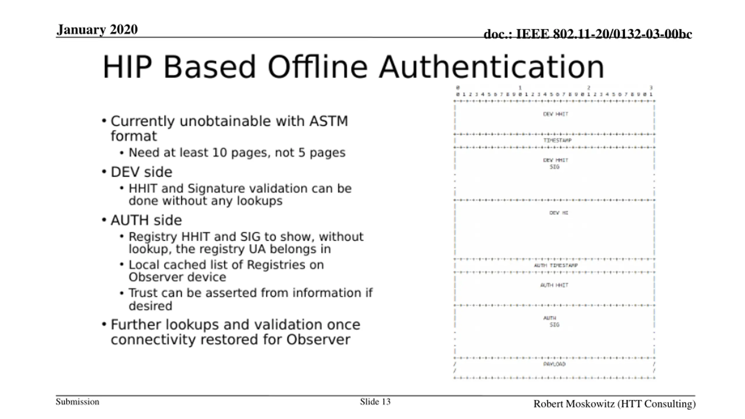 January 2020 doc.: IEEE 802.11-20/0132-03-00bc Submission Slide 13 Robert Moskowitz (HTT Consulting)