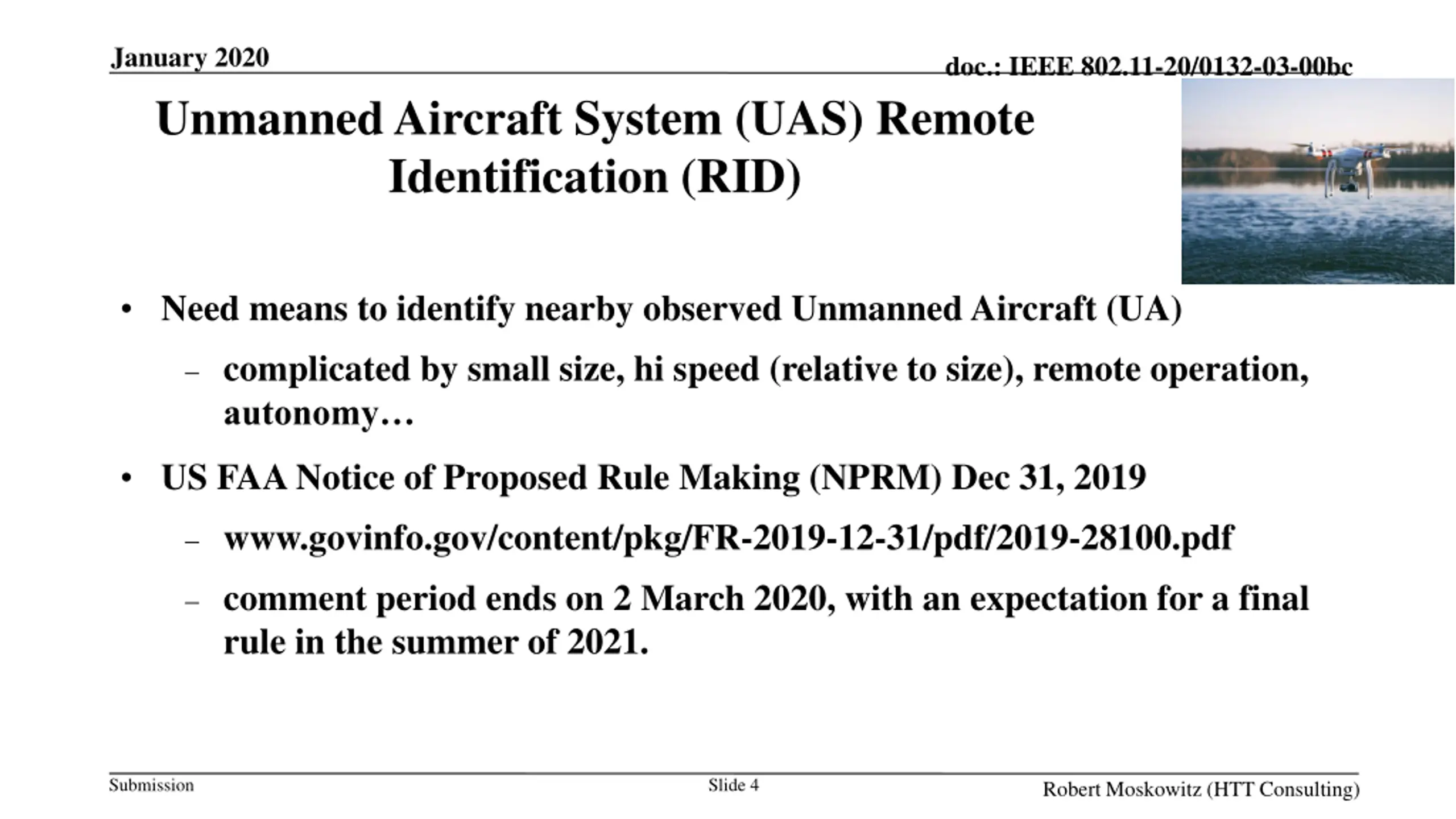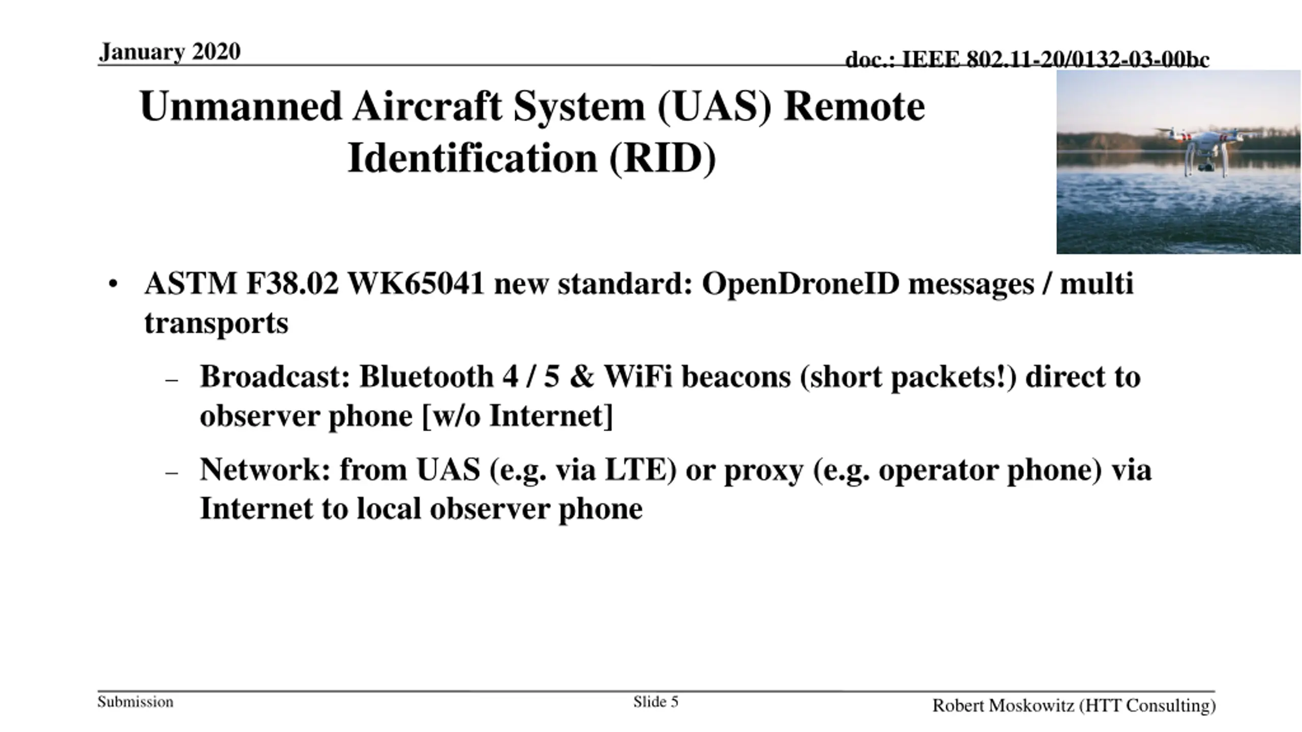 January 2020 doc.: IEEE 802.11-20/0132-03-00bc Unmanned Aircraft System (UAS) Remote Identification (RID) Need means to identify nearby observed Unmanned Aircraft (UA) complicated by small size, hi speed (relative to size), remote operation, autonomy US FAA Notice of Proposed Rule Making (NPRM) Dec 31, 2019 www.govinfo.gov/content/pkg/FR-2019-12-31/pdf/2019-28100.pdf comment period ends on 2 March 2020, with an expectation for a final rule in the summer of 2021. Submission Slide 4 Robert Moskowitz (HTT Consulting)