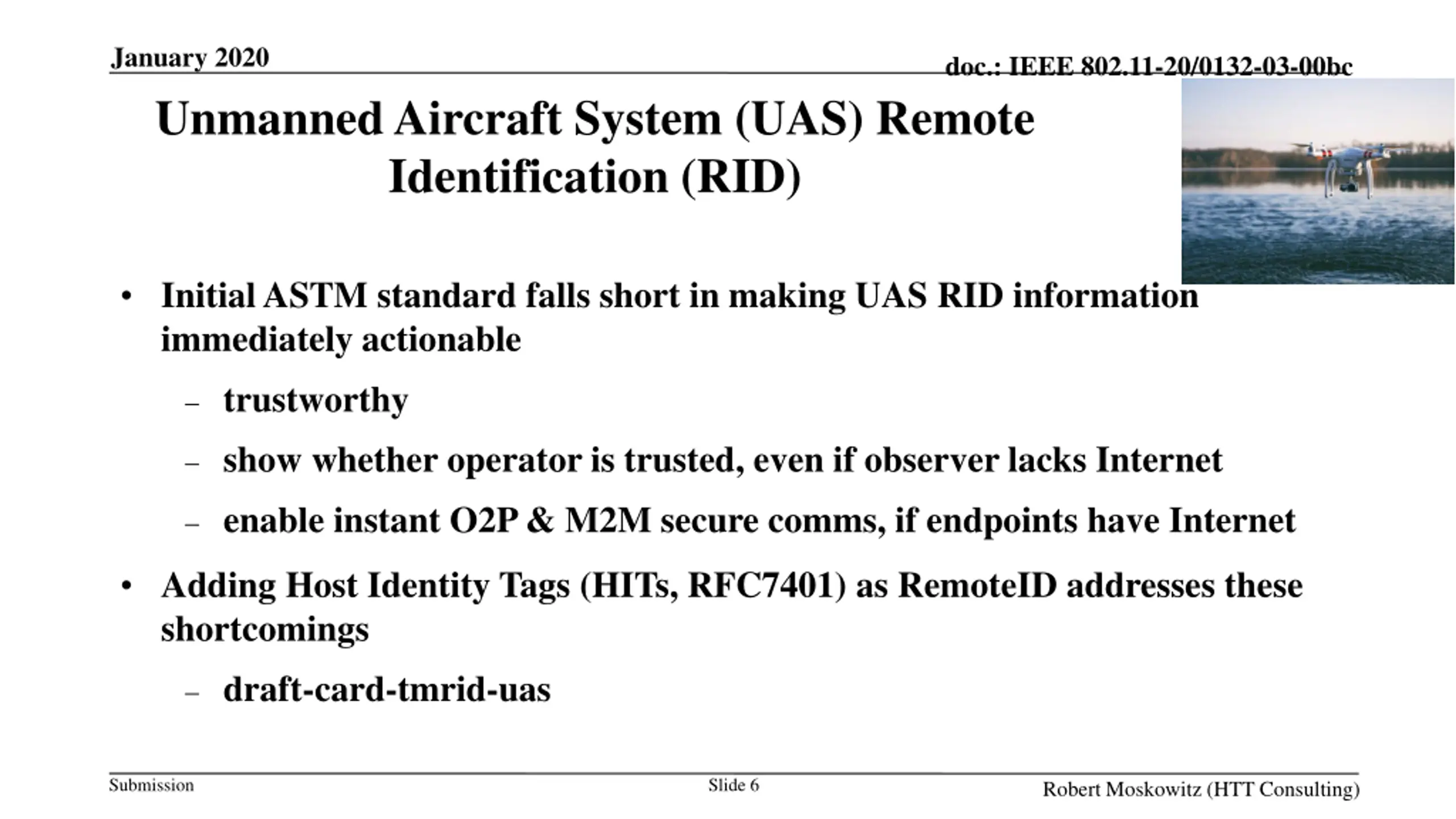 January 2020 doc.: IEEE 802.11-20/0132-03-00bc Unmanned Aircraft System (UAS) Remote Identification (RID) Initial ASTM standard falls short in making UAS RID information immediately actionable trustworthy show whether operator is trusted, even if observer lacks Internet enable instant O2P & M2M secure comms, if endpoints have Internet Adding Host Identity Tags (HITs, RFC7401) as RemoteID addresses these shortcomings draft-card-tmrid-uas Submission Slide 6 Robert Moskowitz (HTT Consulting)