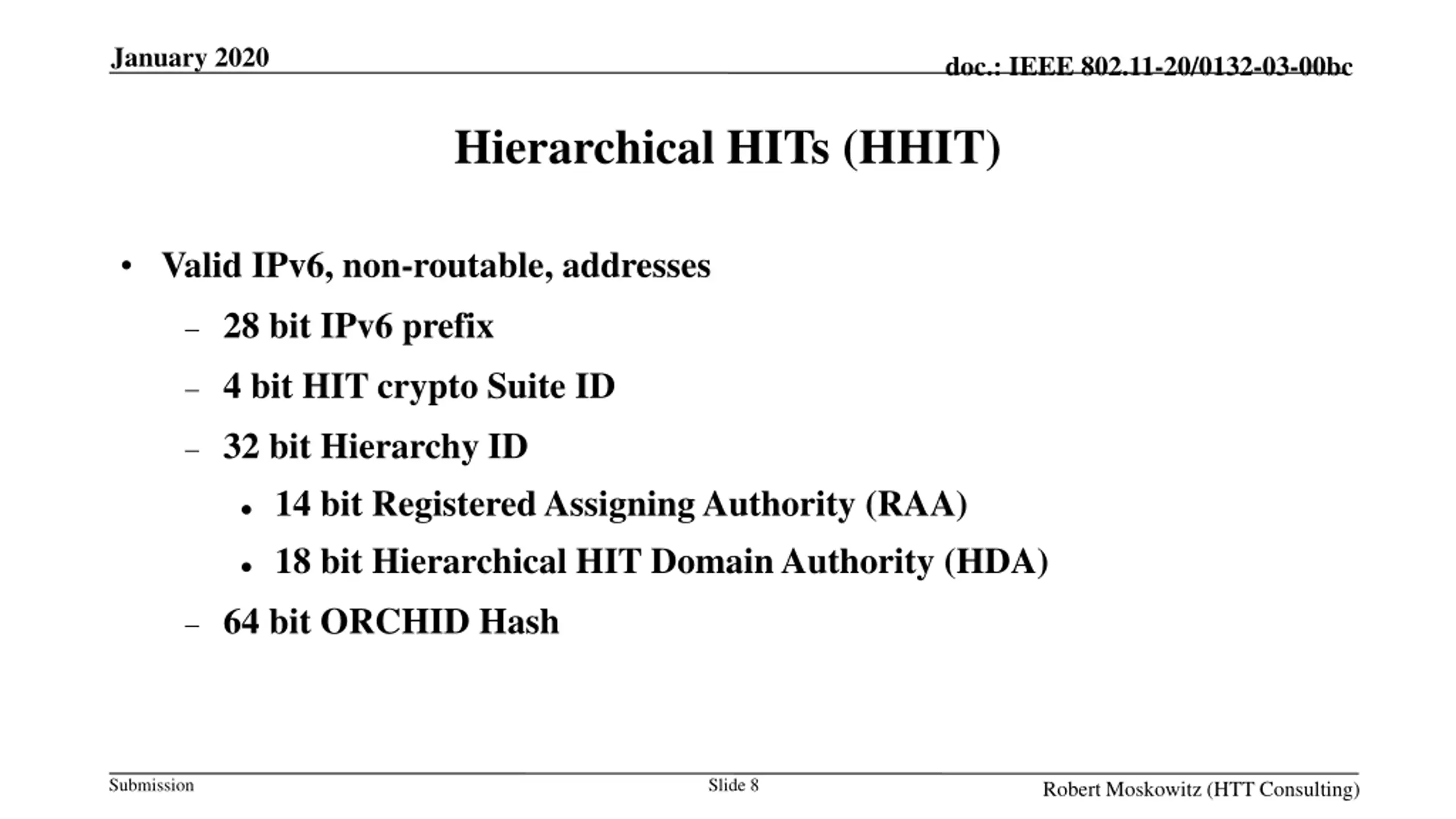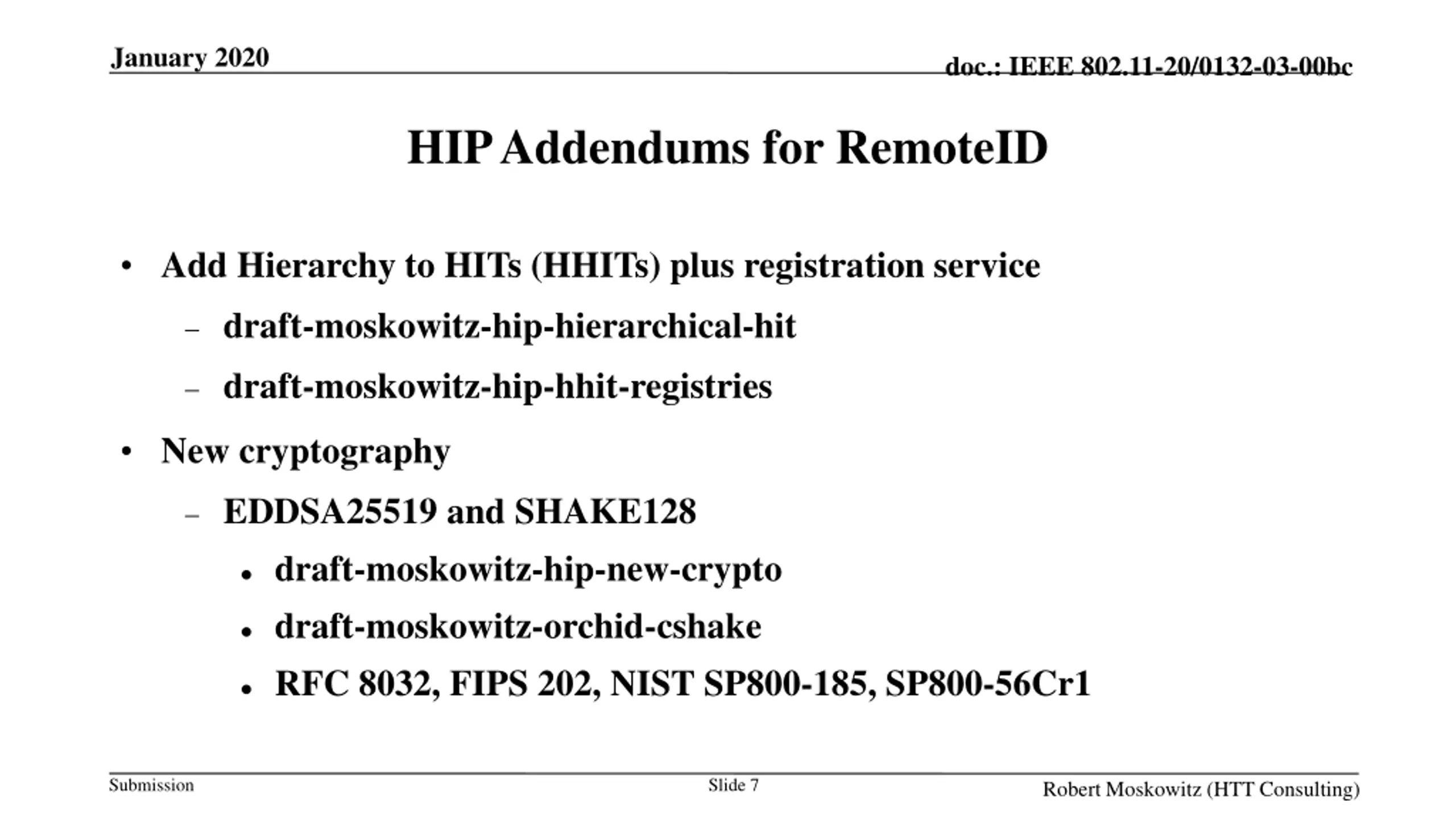 January 2020 doc.: IEEE 802.11-20/0132-03-00bc HIP Addendums for RemoteID Add Hierarchy to HITs (HHITs) plus registration service draft-moskowitz-hip-hierarchical-hit draft-moskowitz-hip-hhit-registries New cryptography EDDSA25519 and SHAKE128 draft-moskowitz-hip-new-crypto draft-moskowitz-orchid-cshake RFC 8032, FIPS 202, NIST SP800-185, SP800-56Cr1 Submission Slide 7 Robert Moskowitz (HTT Consulting)