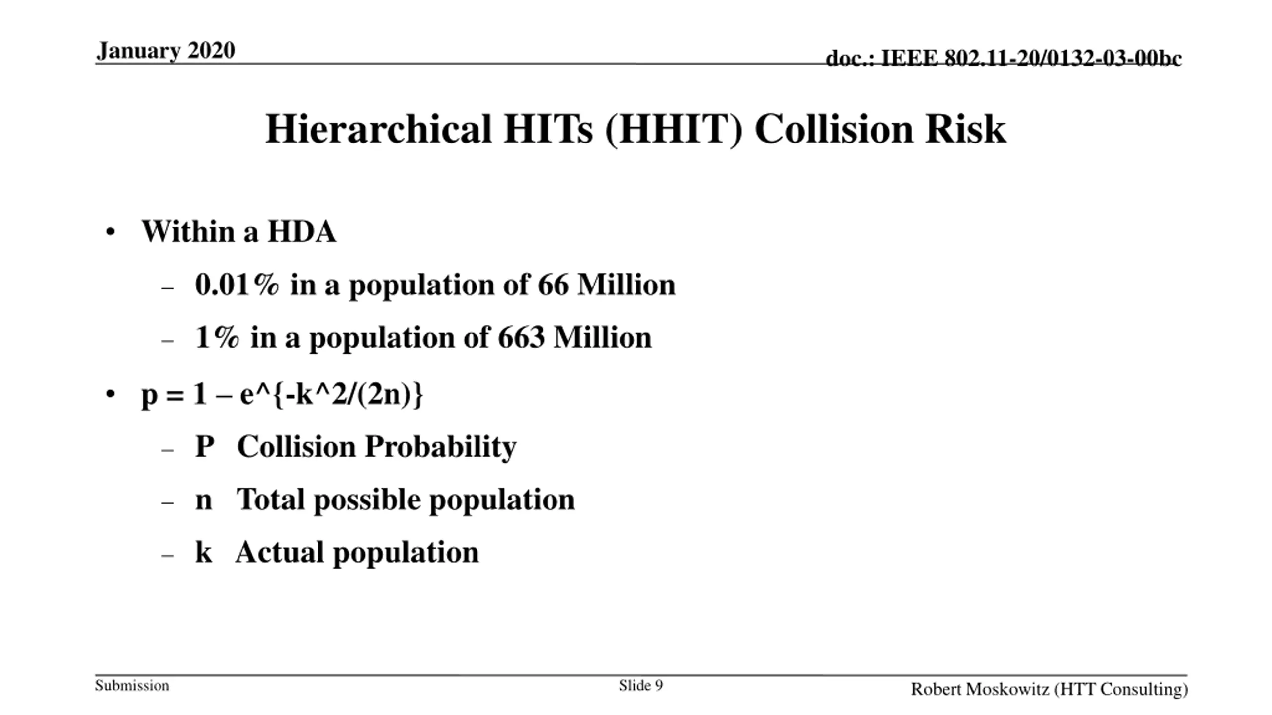 January 2020 doc.: IEEE 802.11-20/0132-03-00bc Hierarchical HITs (HHIT) Collision Risk Within a HDA 0.01% in a population of 66 Million 1% in a population of 663 Million p = 1 e^{-k^2/(2n)} P Collision Probability n Total possible population k Actual population Submission Slide 9 Robert Moskowitz (HTT Consulting)