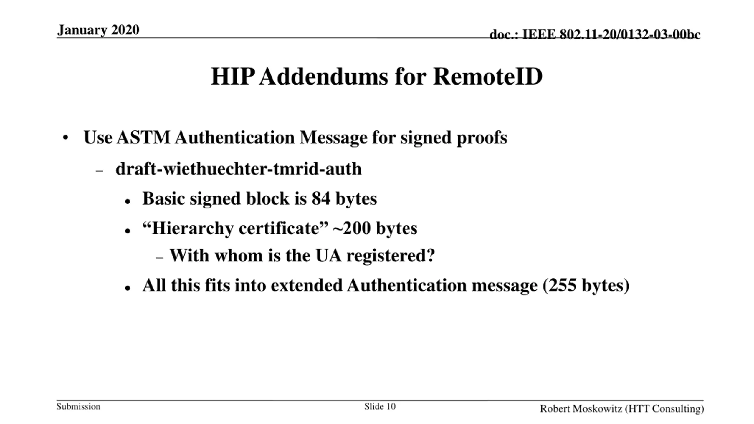 January 2020 doc.: IEEE 802.11-20/0132-03-00bc HIP Addendums for RemoteID Use ASTM Authentication Message for signed proofs draft-wiethuechter-tmrid-auth Basic signed block is 84 bytes Hierarchy certificate ~200 bytes With whom is the UA registered? All this fits into extended Authentication message (255 bytes) Submission Slide 10 Robert Moskowitz (HTT Consulting)