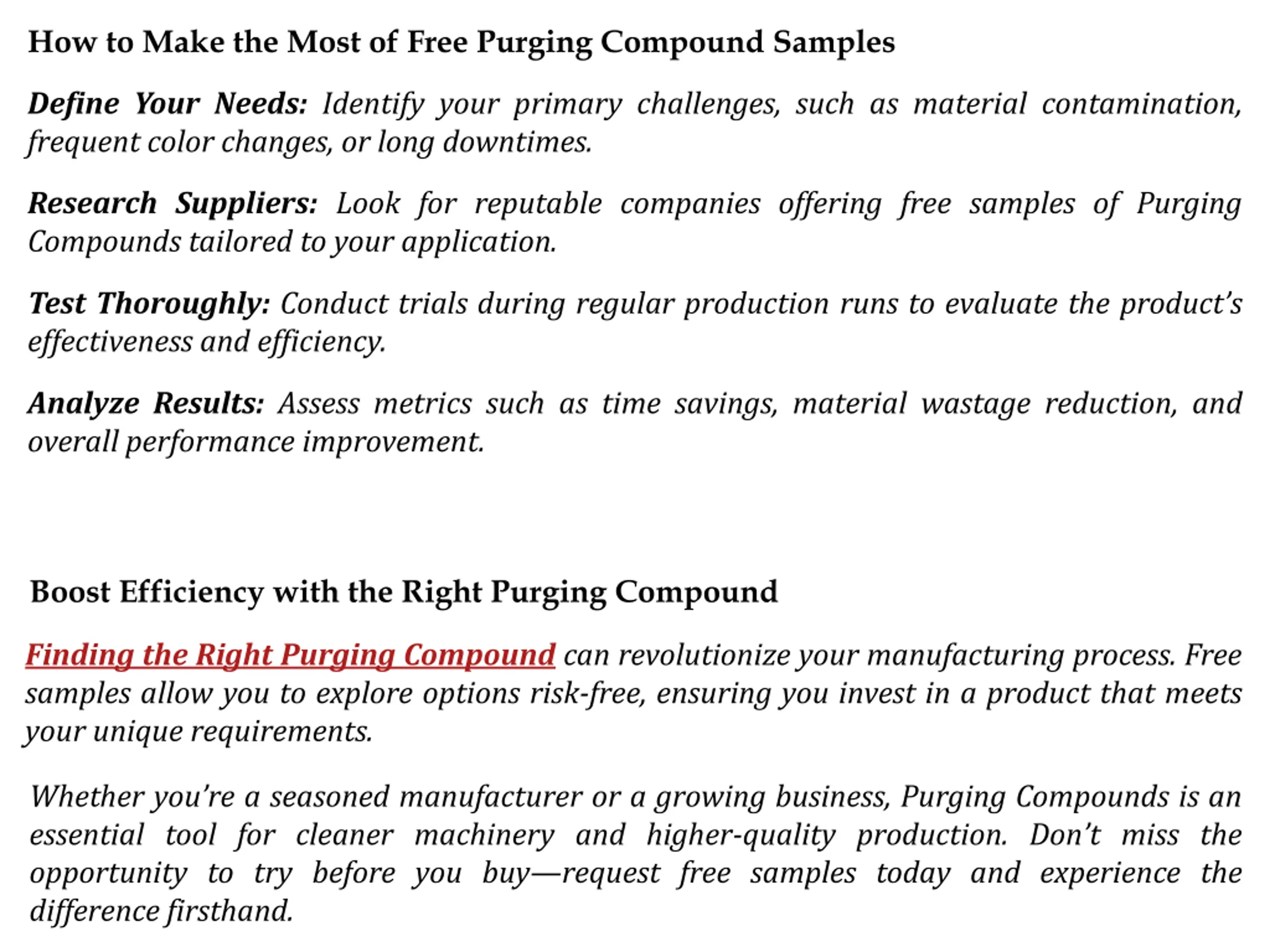 How to Make the Most of Free Purging Compound Samples Define Your Needs: Identify your primary challenges, such as material contamination, frequent color changes, or long downtimes. Research Suppliers: Look for reputable companies offering free samples of Purging Compounds tailored to your application. Test Thoroughly: Conduct trials during regular production runs to evaluate the product s effectiveness and efficiency. Analyze Results: Assess metrics such as time savings, material wastage reduction, and overall performance improvement. Boost Efficiency with the Right Purging Compound Finding the Right Purging Compound can revolutionize your manufacturing process. Free samples allow you to explore options risk-free, ensuring you invest in a product that meets your unique requirements. Whether you re a seasoned manufacturer or a growing business, Purging Compounds is an essential tool for cleaner machinery and higher-quality production. Don t miss the opportunity to try before you buy request free samples today and experience the difference firsthand.