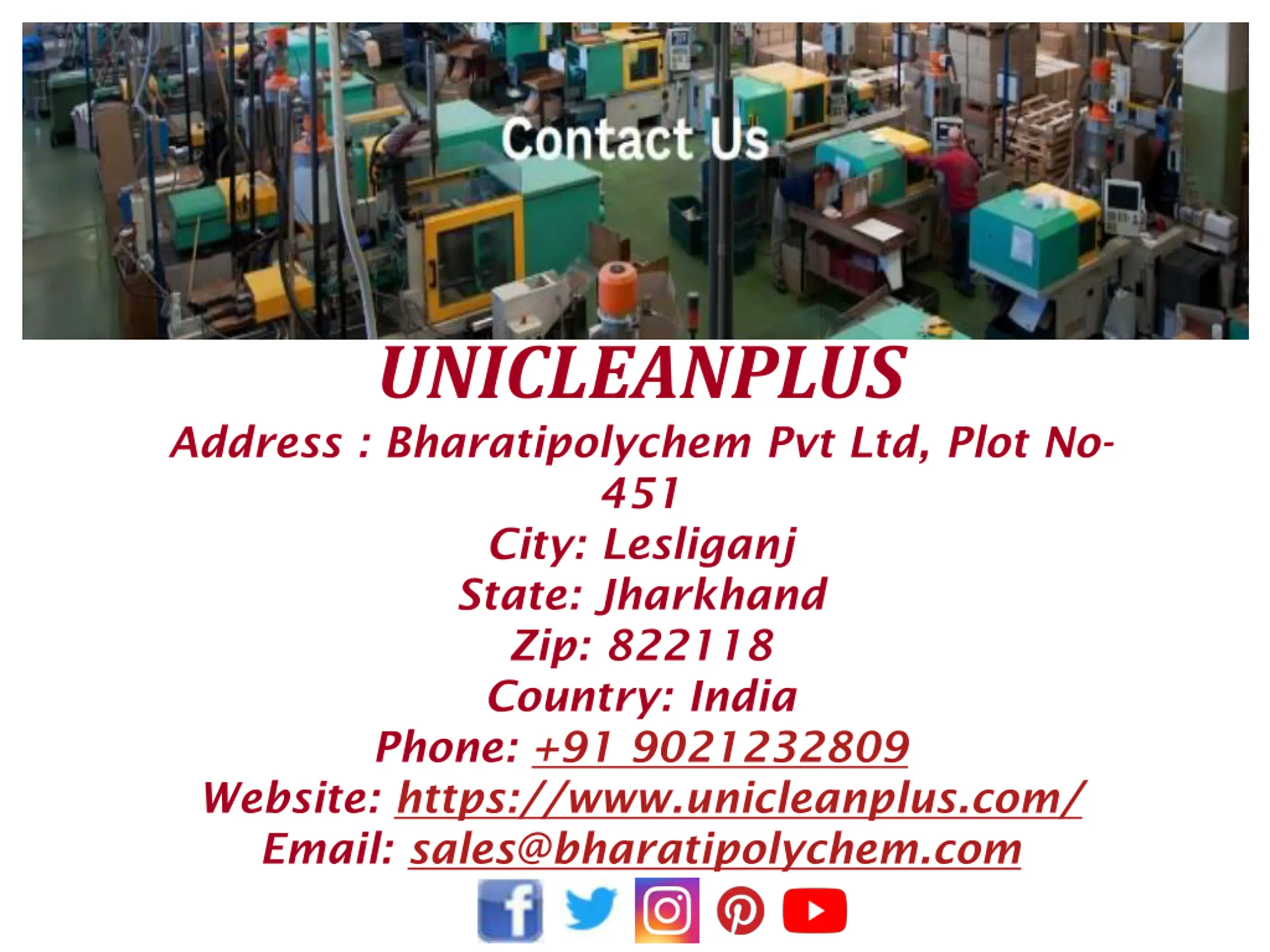 UNICLEANPLUS Address : Bharatipolychem Pvt Ltd, Plot No- 451 City: Lesliganj State: Jharkhand Zip: 822118 Country: India Phone: +91 9021232809 Website: https://www.unicleanplus.com/ Email: sales@bharatipolychem.com facebooklink C:\Users\User\Desktop\twitter.jpg C:\Users\User\Desktop\666282be8229.png C:\Users\User\Desktop\logo_trans_144x144-5e37c0c6.png C:\Users\User\Desktop\favicon_96x96.png