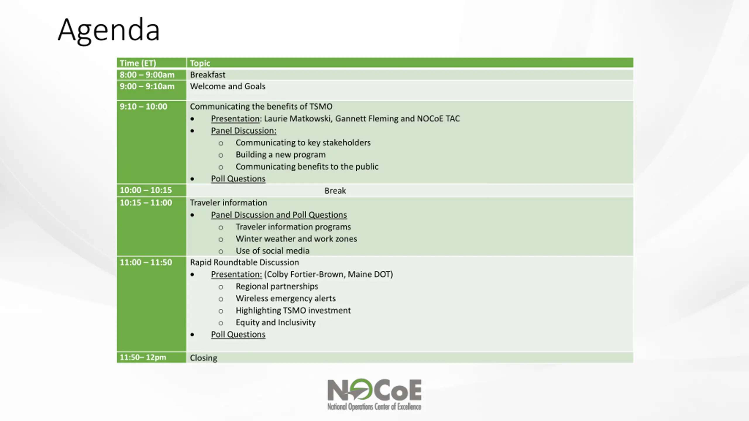 Agenda Time (ET) 8:00 9:00am 9:00 9:10am Topic Breakfast Welcome and Goals 9:10 10:00 Communicating the benefits of TSMO Presentation: Laurie Matkowski, Gannett Fleming and NOCoE TAC Panel Discussion: o Communicating to key stakeholders o Building a new program o Communicating benefits to the public Poll Questions Break Traveler information Panel Discussion and Poll Questions o Traveler information programs o Winter weather and work zones o Use of social media Rapid Roundtable Discussion Presentation: (Colby Fortier-Brown, Maine DOT) o Regional partnerships o Wireless emergency alerts o Highlighting TSMO investment o Equity and Inclusivity Poll Questions 10:00 10:15 10:15 11:00 11:00 11:50 11:50 12pm Closing