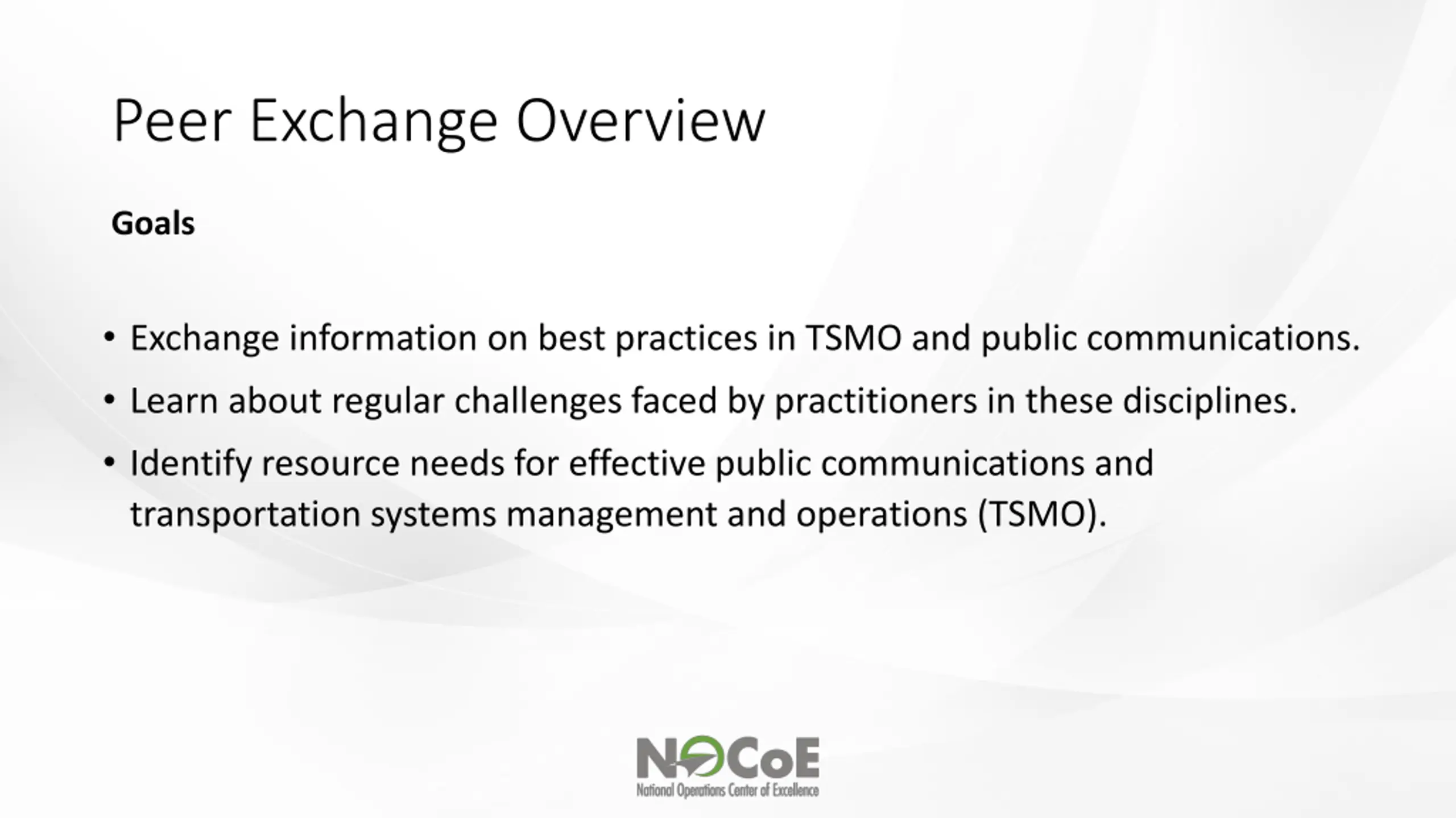Peer Exchange Overview Goals Exchange information on best practices in TSMO and public communications. Learn about regular challenges faced by practitioners in these disciplines. Identify resource needs for effective public communications and transportation systems management and operations (TSMO).