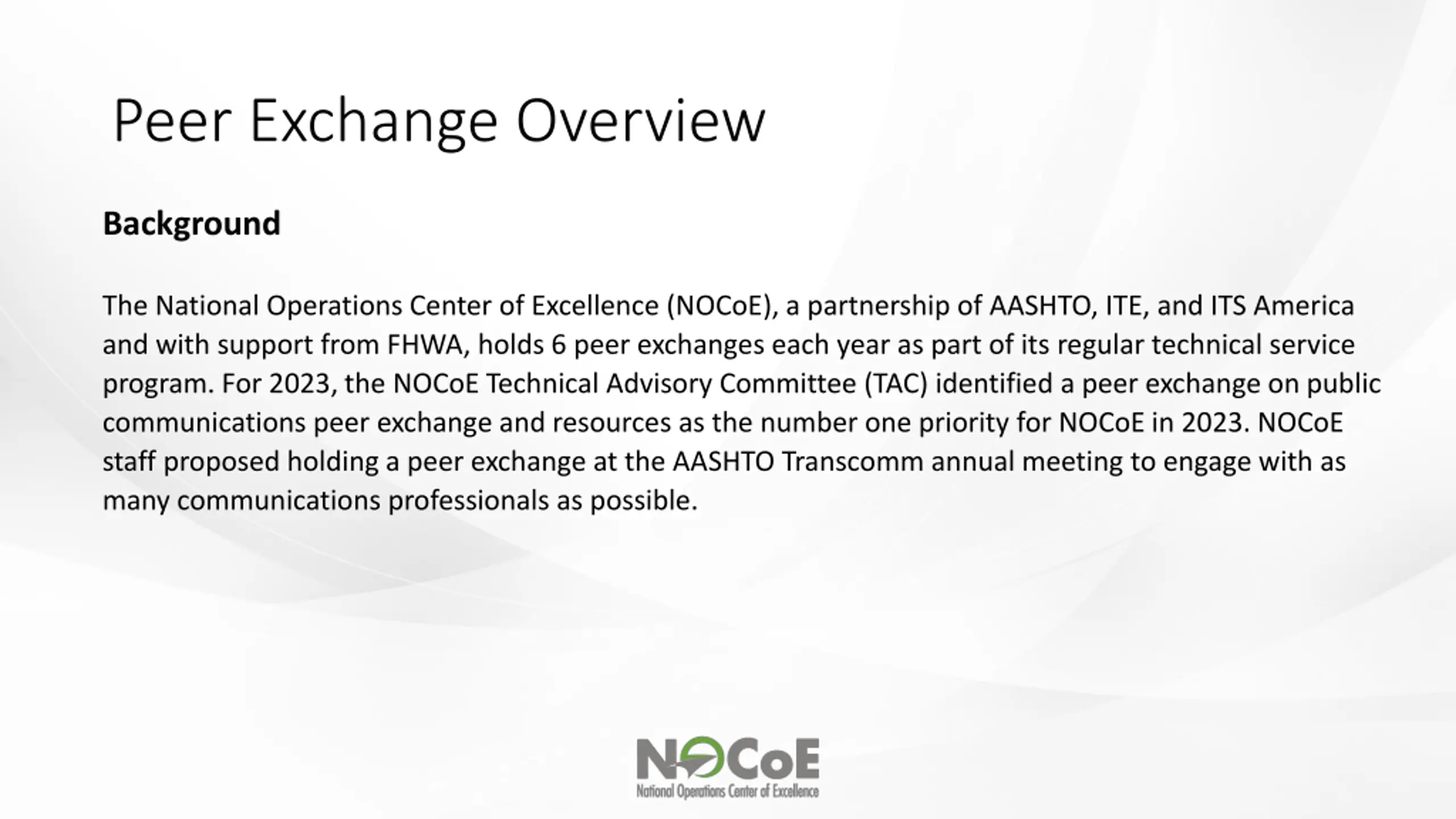 Peer Exchange Overview Background The National Operations Center of Excellence (NOCoE), a partnership of AASHTO, ITE, and ITS America and with support from FHWA, holds 6 peer exchanges each year as part of its regular technical service program. For 2023, the NOCoE Technical Advisory Committee (TAC) identified a peer exchange on public communications peer exchange and resources as the number one priority for NOCoE in 2023. NOCoE staff proposed holding a peer exchange at the AASHTO Transcomm annual meeting to engage with as many communications professionals as possible.