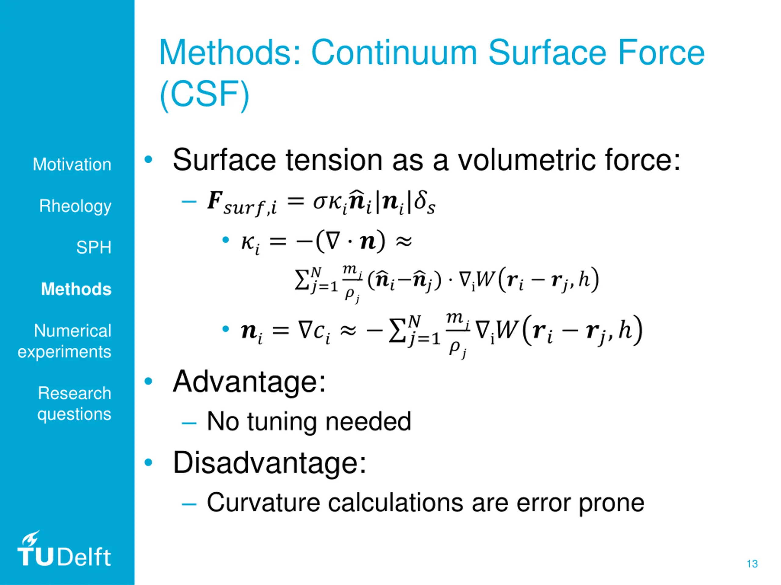 Methods: Continuum Surface Force (CSF) Surface tension as a volumetric force: ?????,?= ??? ??|??|?? ??= ? ?=1 Motivation Rheology SPH ?? ??( ?? ??) i? ?? ??, ??= ?? ?=1 Advantage: No tuning needed Disadvantage: Curvature calculations are error prone ? Methods ?? ?? i? ?? ??, ? Numerical experiments Research questions 13