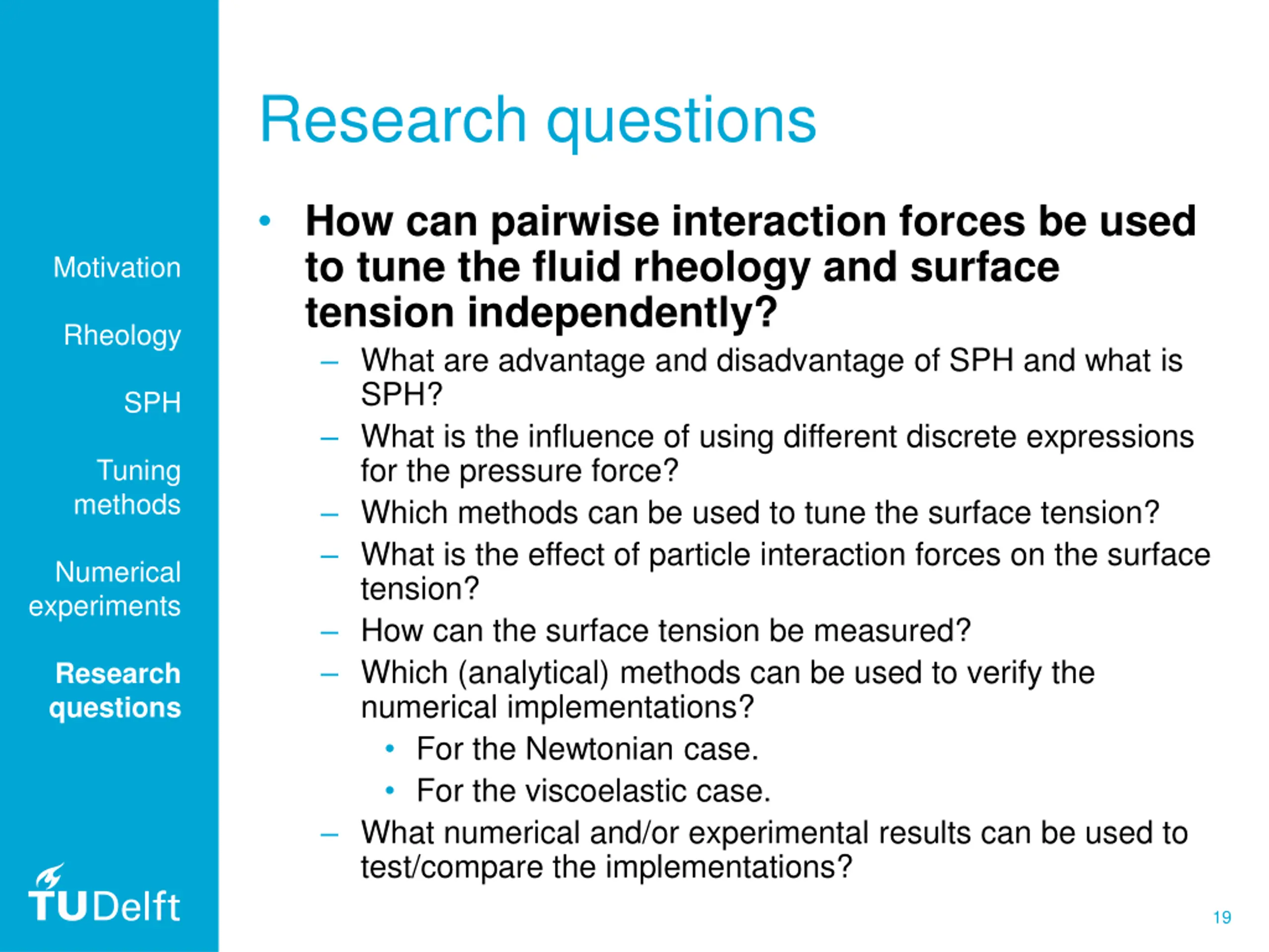 Research questions How can pairwise interaction forces be used to tune the fluid rheology and surface tension independently? What are advantage and disadvantage of SPH and what is SPH? What is the influence of using different discrete expressions for the pressure force? Which methods can be used to tune the surface tension? What is the effect of particle interaction forces on the surface tension? How can the surface tension be measured? Which (analytical) methods can be used to verify the numerical implementations? For the Newtonian case. For the viscoelastic case. What numerical and/or experimental results can be used to test/compare the implementations? Motivation Rheology SPH Tuning methods Numerical experiments Research questions 19