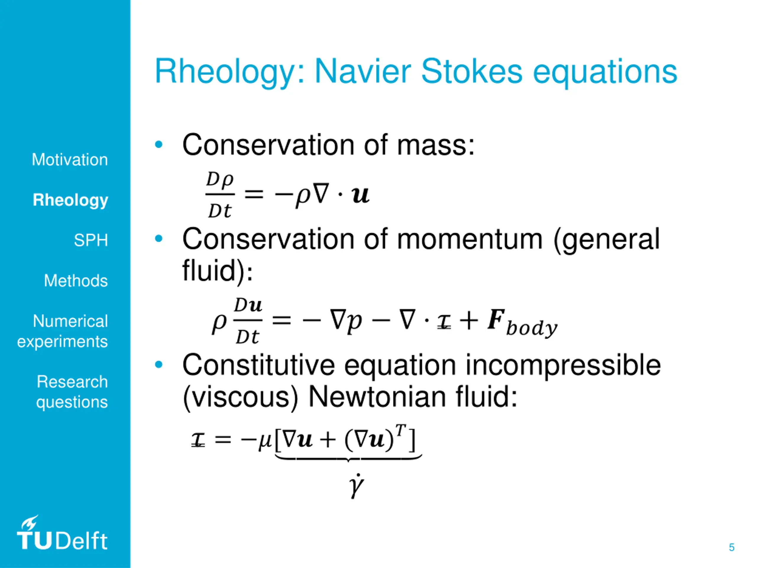 Motivation Particle interaction forces (PIF) Smoothed Particle Hydrodynamics (SPH) Large deformations Complex (free) surfaces Multi-phases PIF also affects the surface tension Main research question: How can particle interaction forces be used to tune the fluid rheology and surface tension independently? Motivation Rheology SPH Methods Numerical experiments Research questions 4
