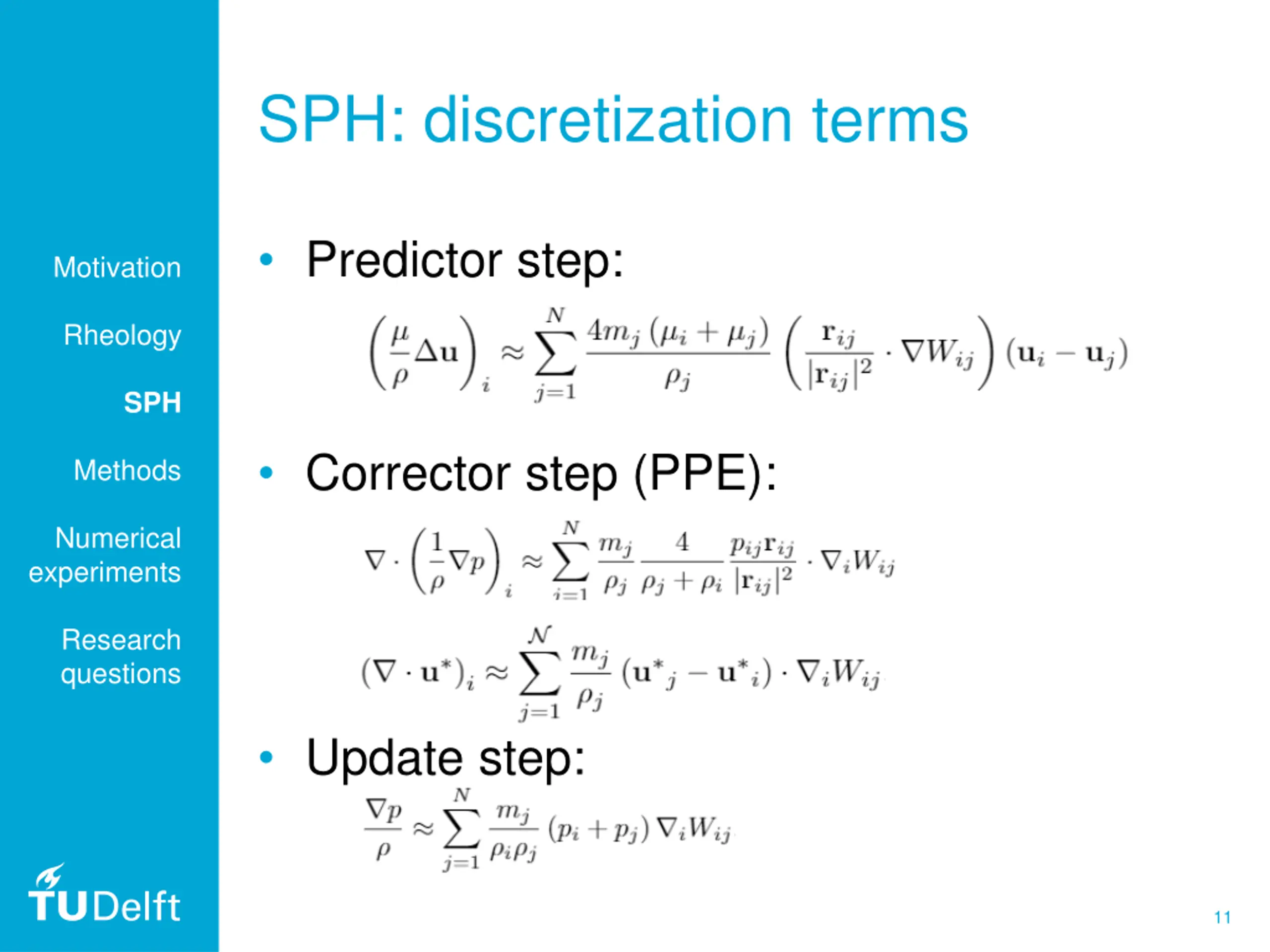 SPH: discretization terms Predictor step: Motivation Rheology SPH Corrector step (PPE): Methods Numerical experiments Research questions Update step: 11