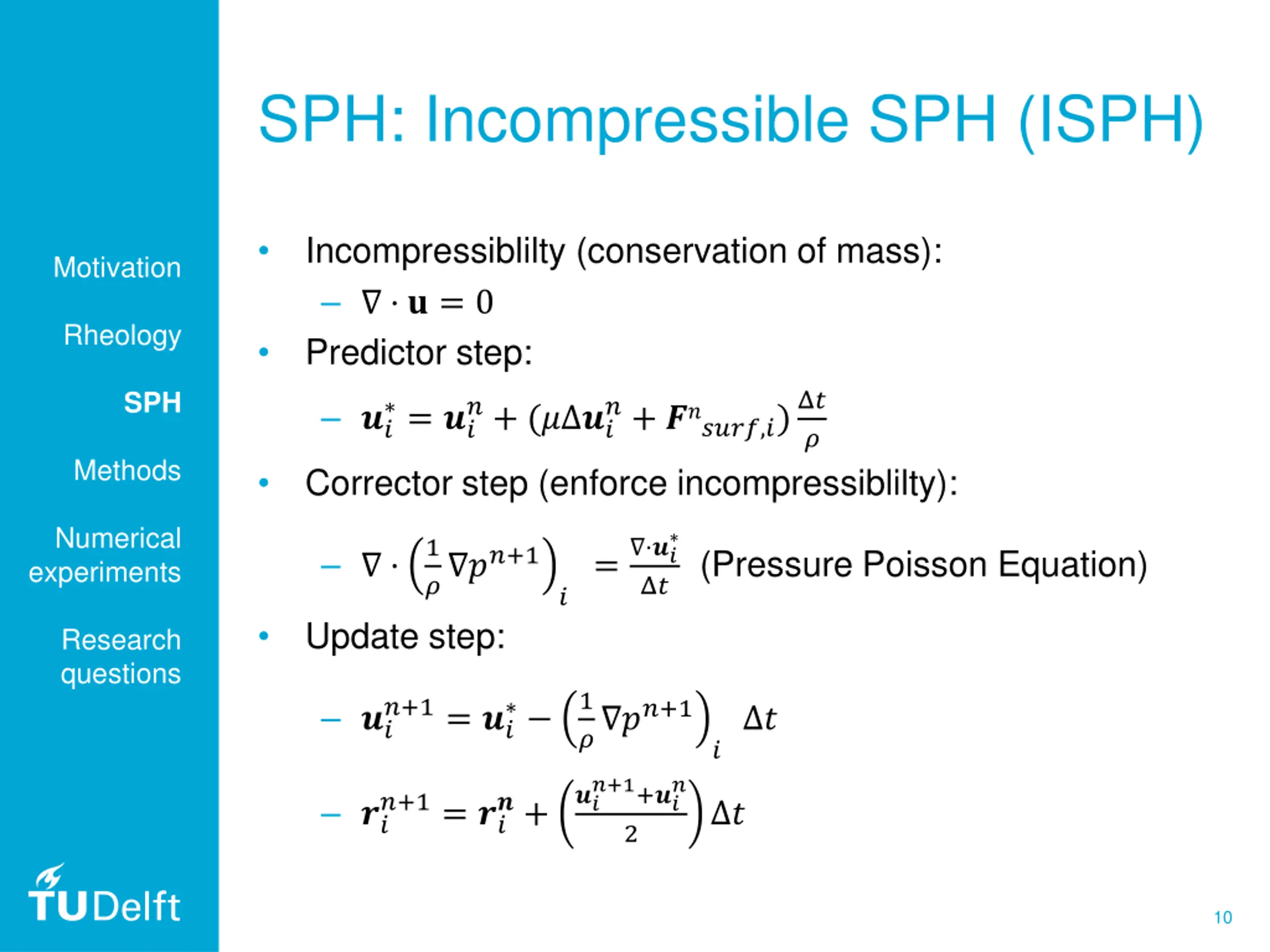 SPH: Incompressible SPH (ISPH) Incompressiblilty (conservation of mass): ? = 0 Predictor step: Motivation Rheology SPH ?+ ??????,?) ? ?+ (? ?? = ?? ?? ? Methods Corrector step (enforce incompressiblilty): Numerical experiments ?? ? 1 ? ??+1 (Pressure Poisson Equation) = ? Update step: Research questions 1 ? ??+1 ?+1= ?? ?? ? ? ?+1+?? 2 ? ?? ?+1= ?? ?+ ?? ? 10