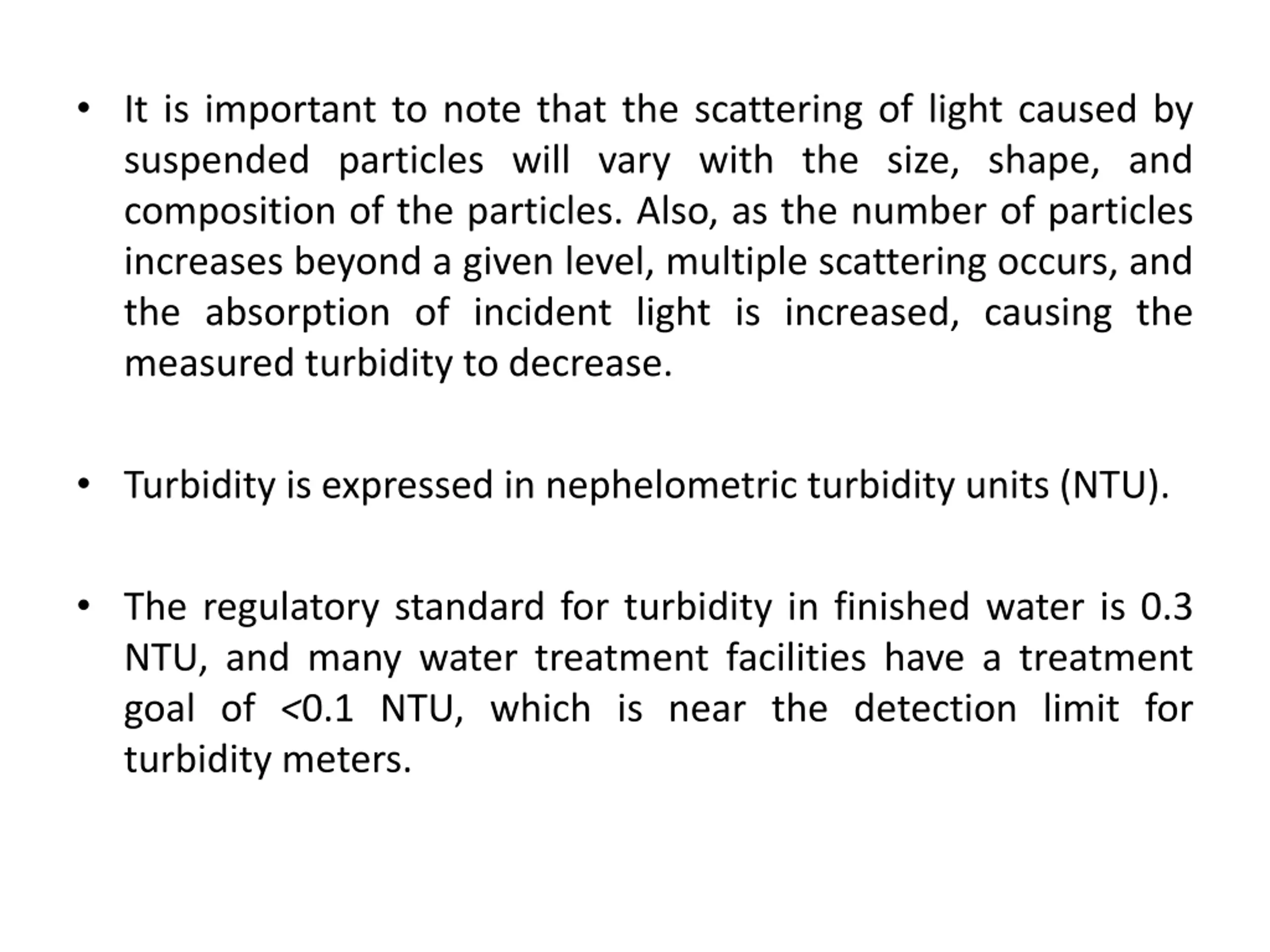 It is important to note that the scattering of light caused by suspended particles will vary with the size, shape, and composition of the particles. Also, as the number of particles increases beyond a given level, multiple scattering occurs, and the absorption of incident light is increased, causing the measured turbidity to decrease. Turbidity is expressed in nephelometric turbidity units (NTU). The regulatory standard for turbidity in finished water is 0.3 NTU, and many water treatment facilities have a treatment goal of <0.1 NTU, which is near the detection limit for turbidity meters.