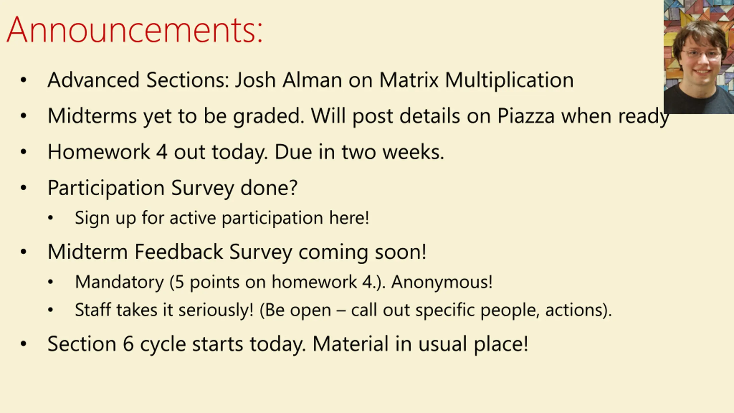 Announcements: Advanced Sections: Josh Alman on Matrix Multiplication Midterms yet to be graded. Will post details on Piazza when ready Homework 4 out today. Due in two weeks. Participation Survey done? Sign up for active participation here! Midterm Feedback Survey coming soon! Mandatory (5 points on homework 4.). Anonymous! Staff takes it seriously! (Be open call out specific people, actions). Section 6 cycle starts today. Material in usual place!
