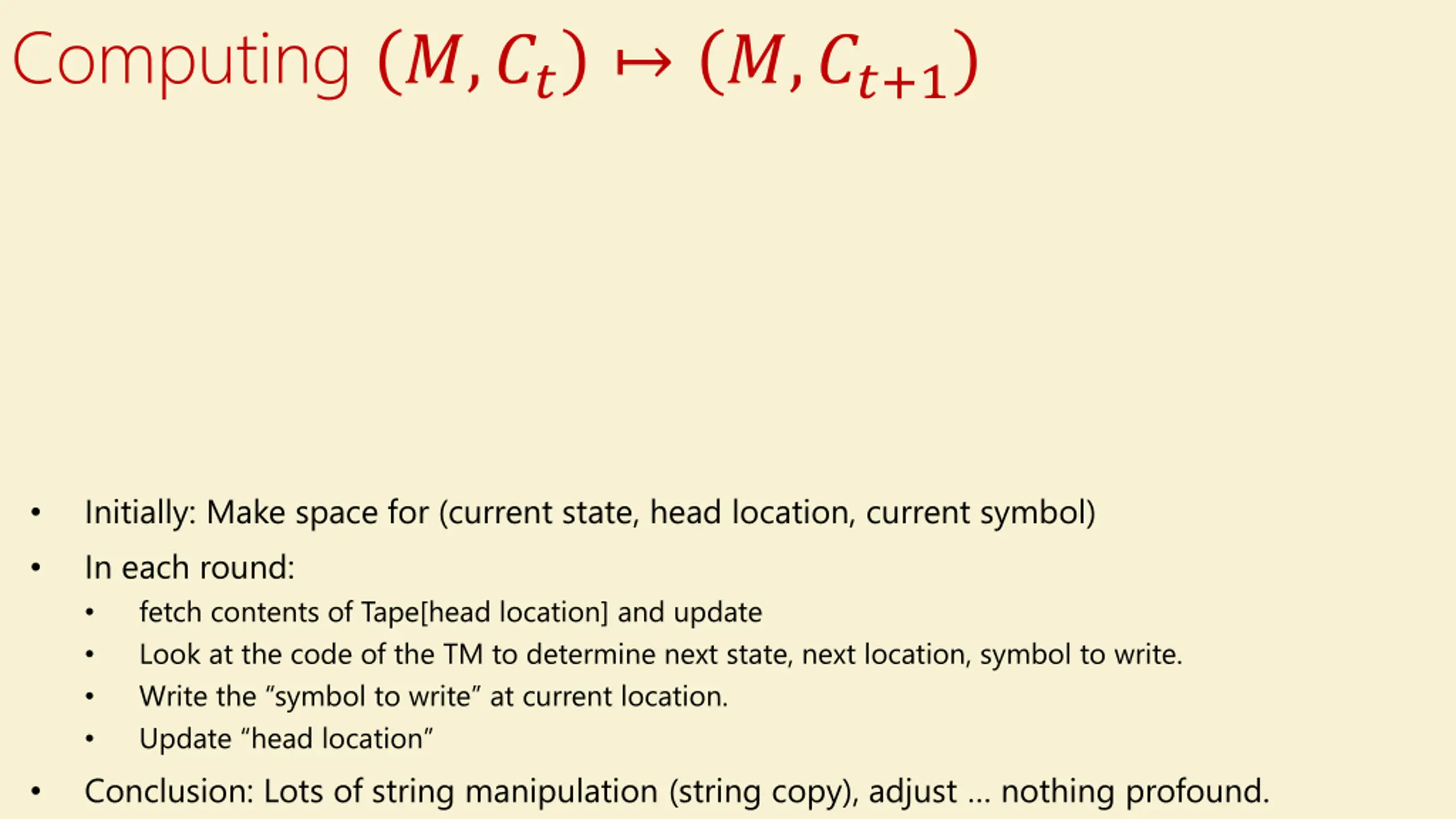 Computing ?,?? ?,??+1 Initially: Make space for (current state, head location, current symbol) In each round: fetch contents of Tape[head location] and update Look at the code of the TM to determine next state, next location, symbol to write. Write the symbol to write at current location. Update head location Conclusion: Lots of string manipulation (string copy), adjust nothing profound.