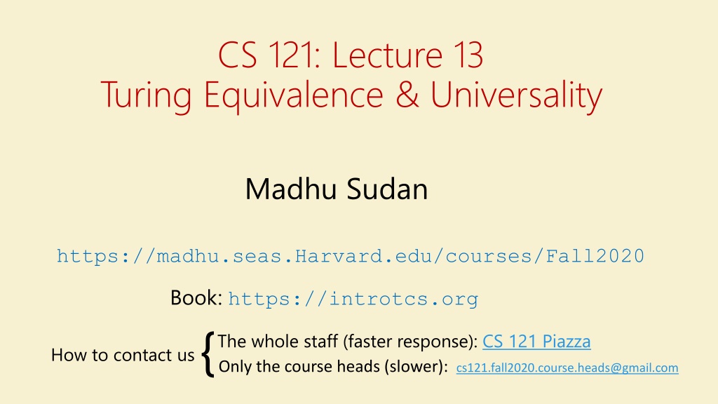 CS 121: Lecture 13 Turing Equivalence & Universality Madhu Sudan https://madhu.seas.Harvard.edu/courses/Fall2020 Book: https://introtcs.org { The whole staff (faster response): CS 121 Piazza How to contact us Only the course heads (slower): cs121.fall2020.course.heads@gmail.com