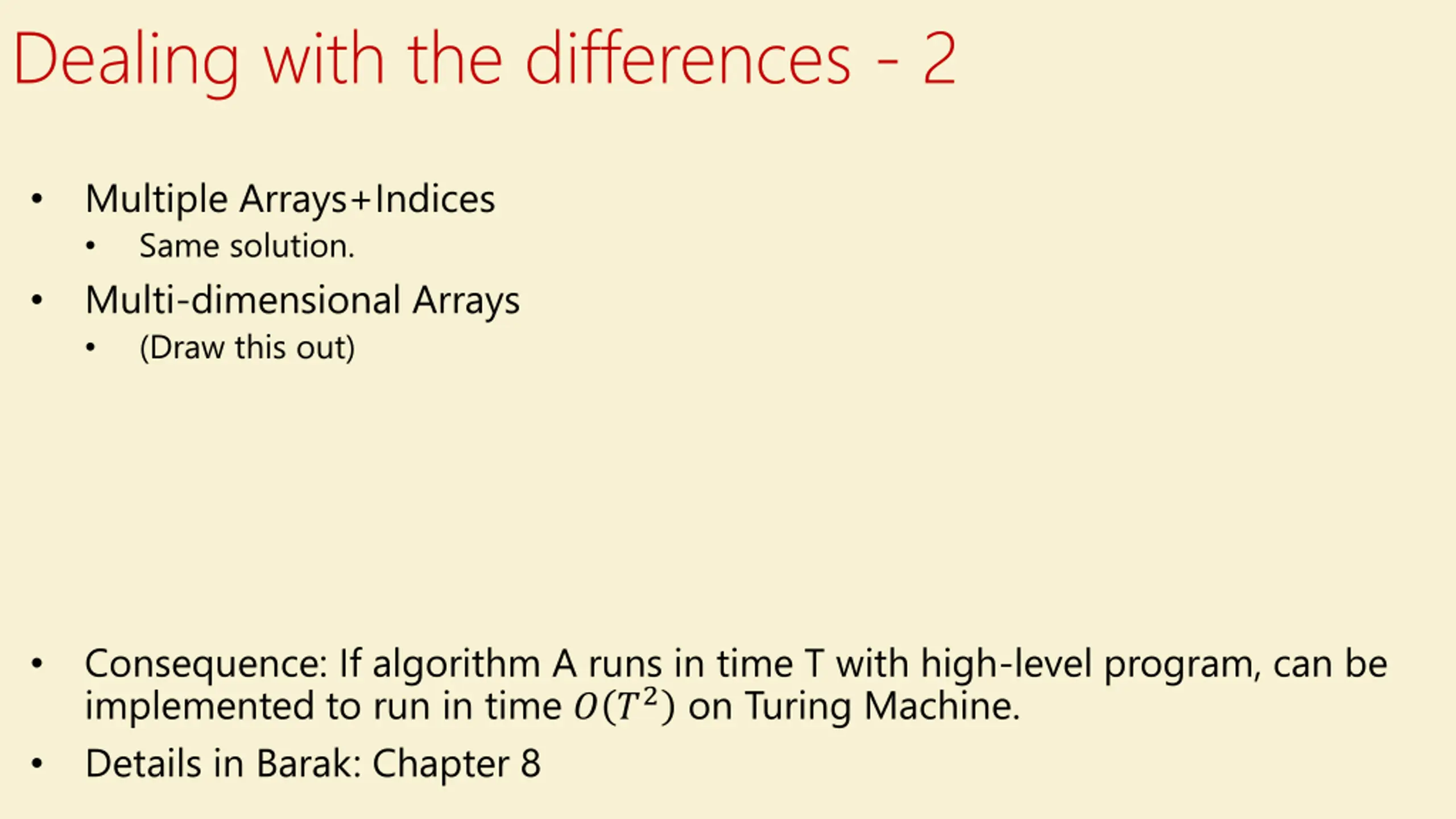 Dealing with the differences - 2 Multiple Arrays+Indices Same solution. Multi-dimensional Arrays (Draw this out) Consequence: If algorithm A runs in time T with high-level program, can be implemented to run in time ? ?2 on Turing Machine. Details in Barak: Chapter 8
