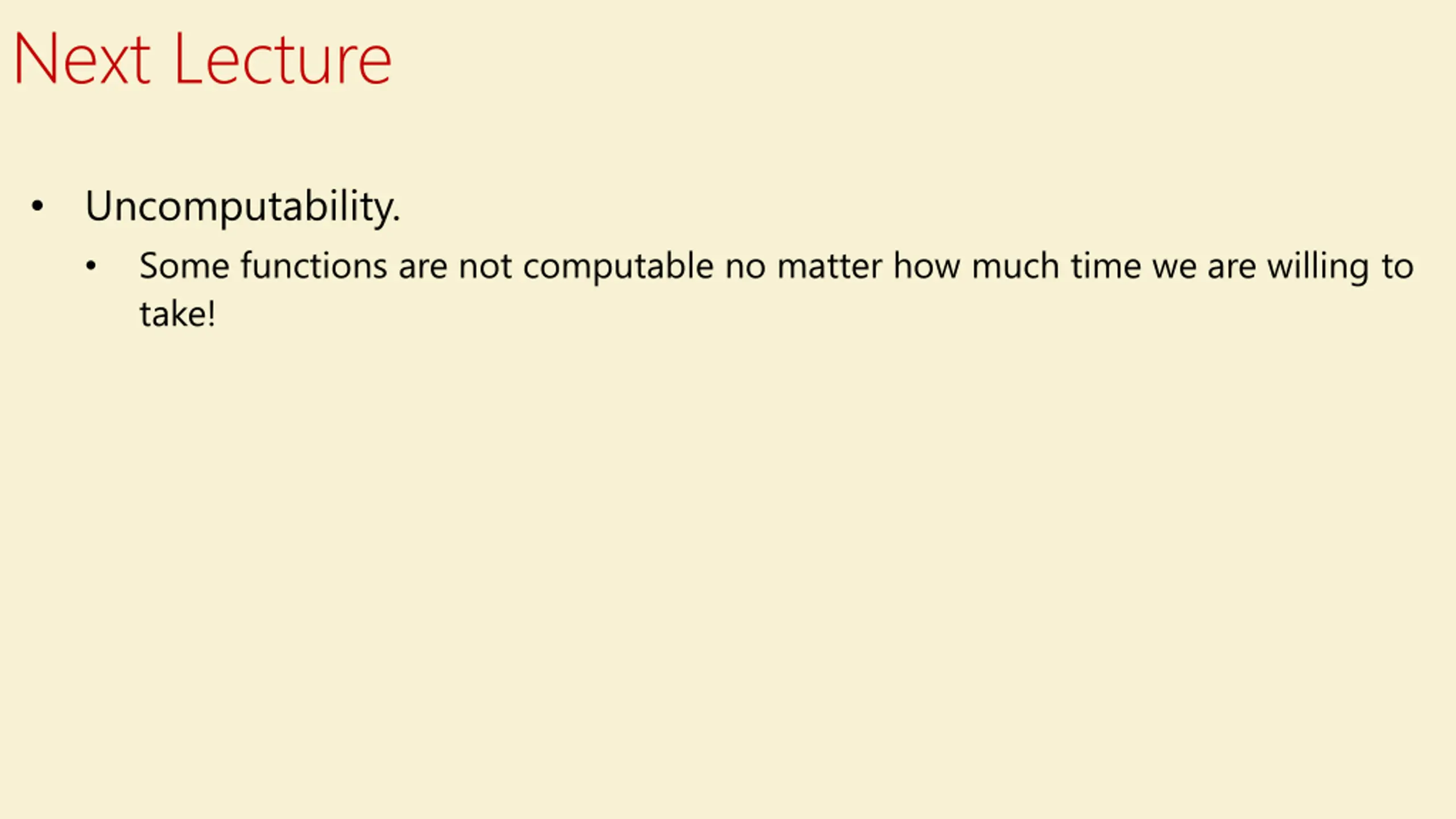 Next Lecture Uncomputability. Some functions are not computable no matter how much time we are willing to take!