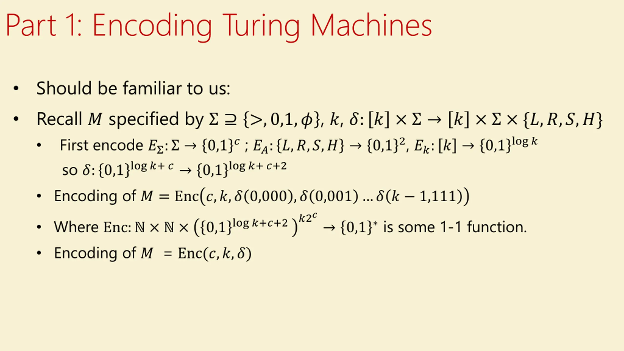 Part 1: Encoding Turing Machines Should be familiar to us: Recall ? specified by >,0,1,? , ?, ?: ? ? {?,?,?,?} First encode ? : 0,1? ; ??: ?,?,?,? 0,12, ??: ? 0,1log ? so ?: 0,1log ?+ ? 0,1log ?+ ?+2 Encoding of ? = Enc ?,?,? 0,000 ,? 0,001 ? ? 1,111 0,1log ?+?+2 ?2? Encoding of ? = Enc(?,?,?) Where Enc: 0,1 is some 1-1 function.