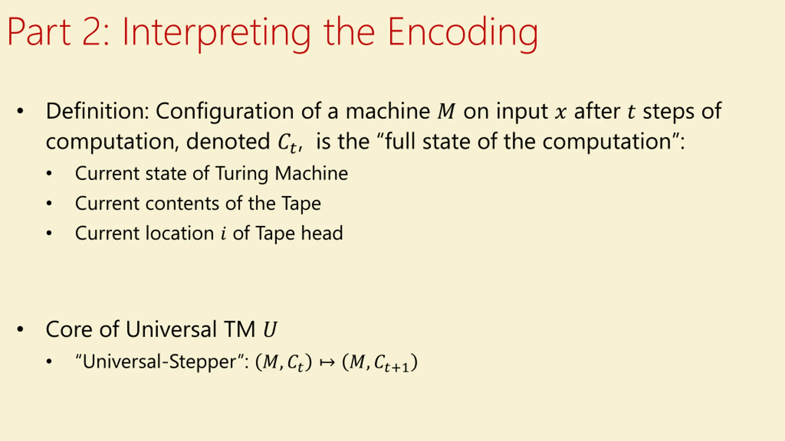 Part 2: Interpreting the Encoding Definition: Configuration of a machine ? on input ? after ? steps of computation, denoted ??, is the full state of the computation : Current state of Turing Machine Current contents of the Tape Current location ? of Tape head Core of Universal TM ? Universal-Stepper : ?,?? ?,??+1